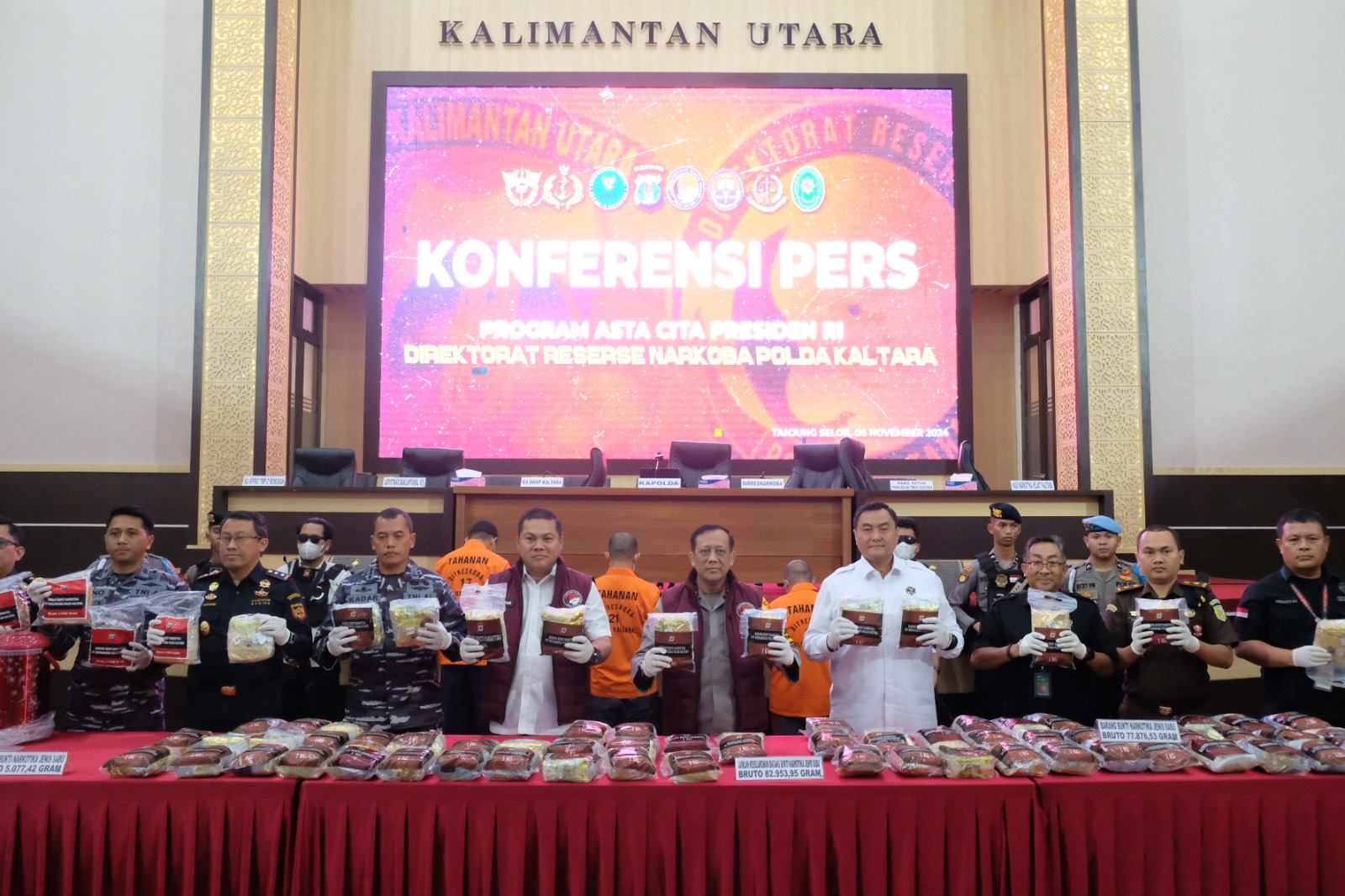 Menindaklanjuti arahan dari Bapak Presiden RI dan Bapak Kapolri tersebut, Polda Kaltara bersama- sama dengan Instansi Terkait (Kejati Kaltara, Badan Narkotika Nasional Prov. Kaltara, TNI AL, Ditjen Bea dan Cukai, Pengadilan Tinggi Prov. Kaltara) Dalam Kurun Waktu 3 Bulan (Agustus S/D Oktober 2024) Telah melaksanakan Joint Operation Pengungkapan 68 Perkara Yang Diantaranya Merupakan 1 ( satu ) Jaringan Narkoba Internasional.