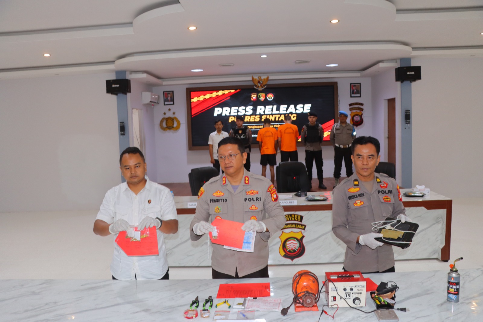 Polda Kalbar – Polres Sintang menggelar press release pengungkapan tindak pidana penipuan mengenai penjualan emas palsu yang terjadi di wilayah Kabupaten Sintang, Rabu (29/5).
