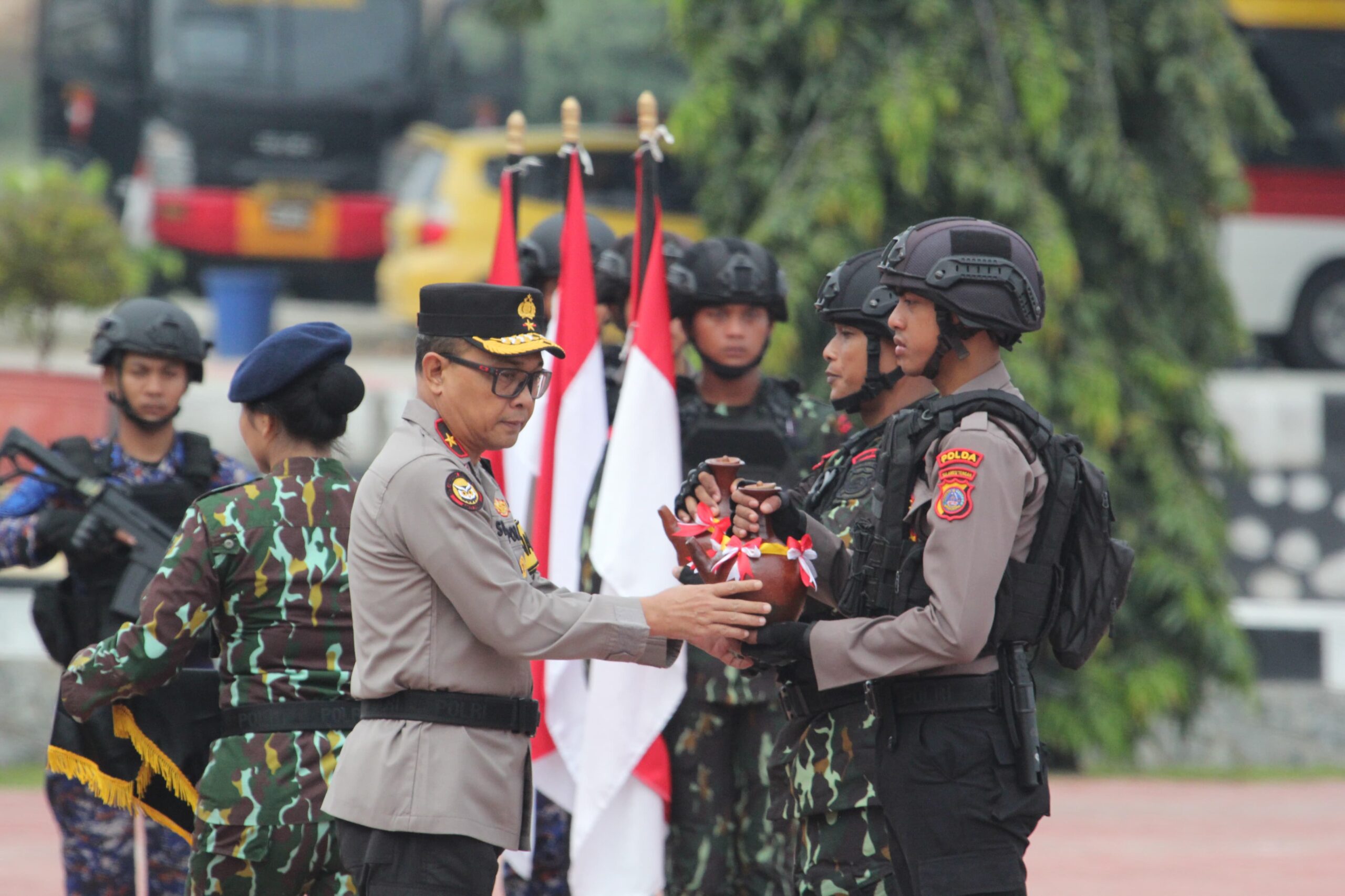 PALU, Salah satu acara tradisi menjelang Hari Ulang Tahun (HUT) Bhayangkara ke-78, Polda Sulawesi Tengah (Sulteng) menggelar Upacara Tradisi Pengambilan Air Suci di Lapangan Polda Sulteng dipimpin Wakapolda Brigjen Pol. Soeseno Noerhandoko, SIK, Jumat (7/6/2024)