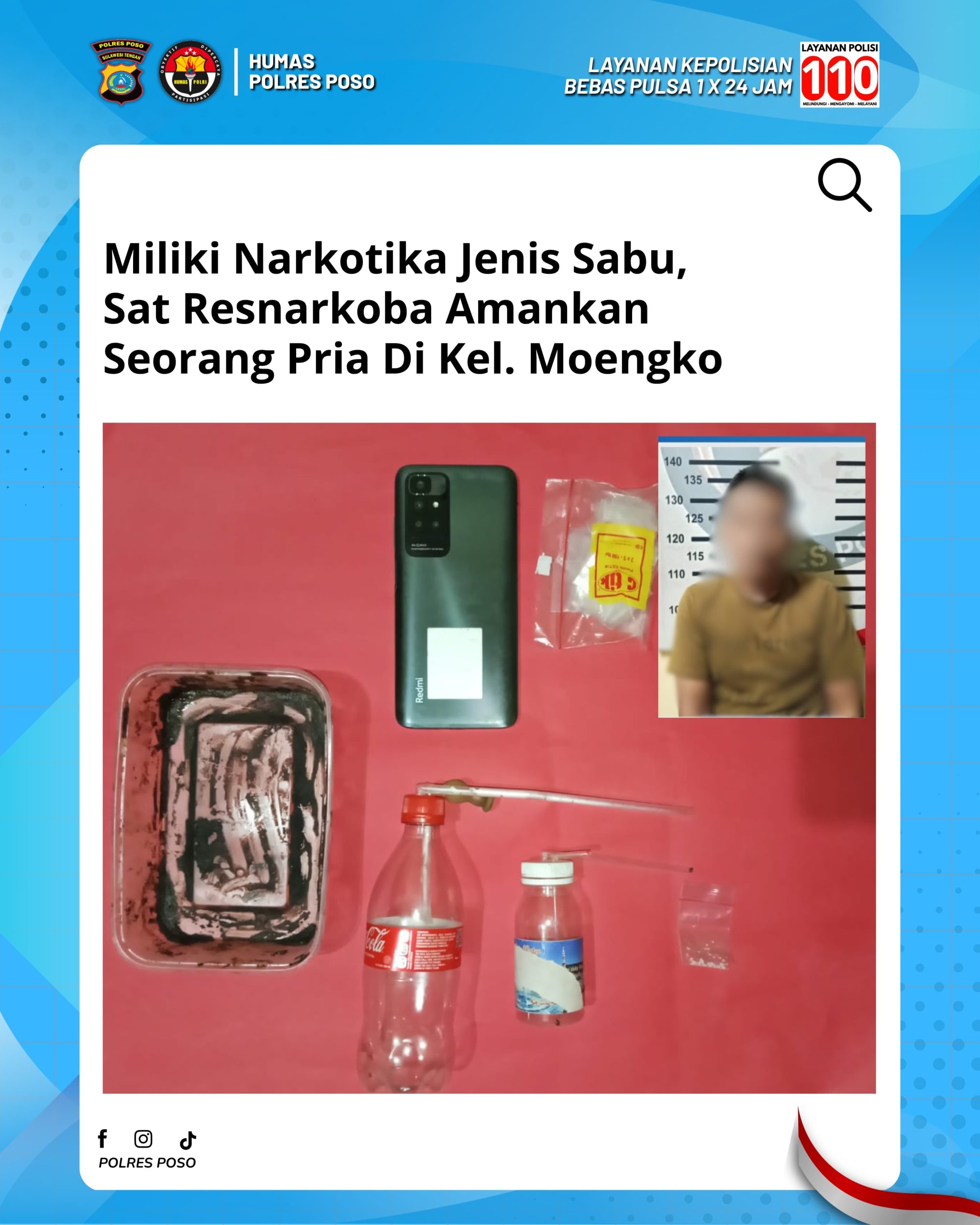 Poso – Satuan Reserse Narkoba (Satresnarkoba) Polres Poso kembali berhasil mengungkap tindak pidana penyalahgunaan narkotika jenis sabu di wilayah Kelurahan Moengko Baru, Kecamatan Poso Kota, Kabupaten Poso.