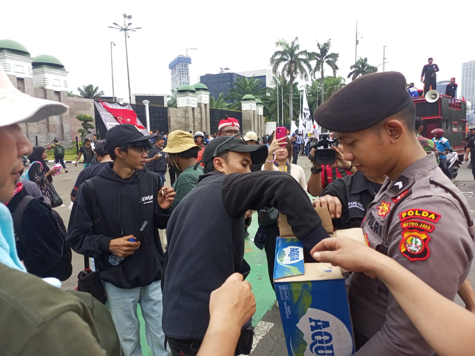 Pembagian air mineral dan roti ini menjadi bagian dari upaya Polri dalam memberikan pelayanan humanis kepada masyarakat yang sedang menyampaikan aspirasi.