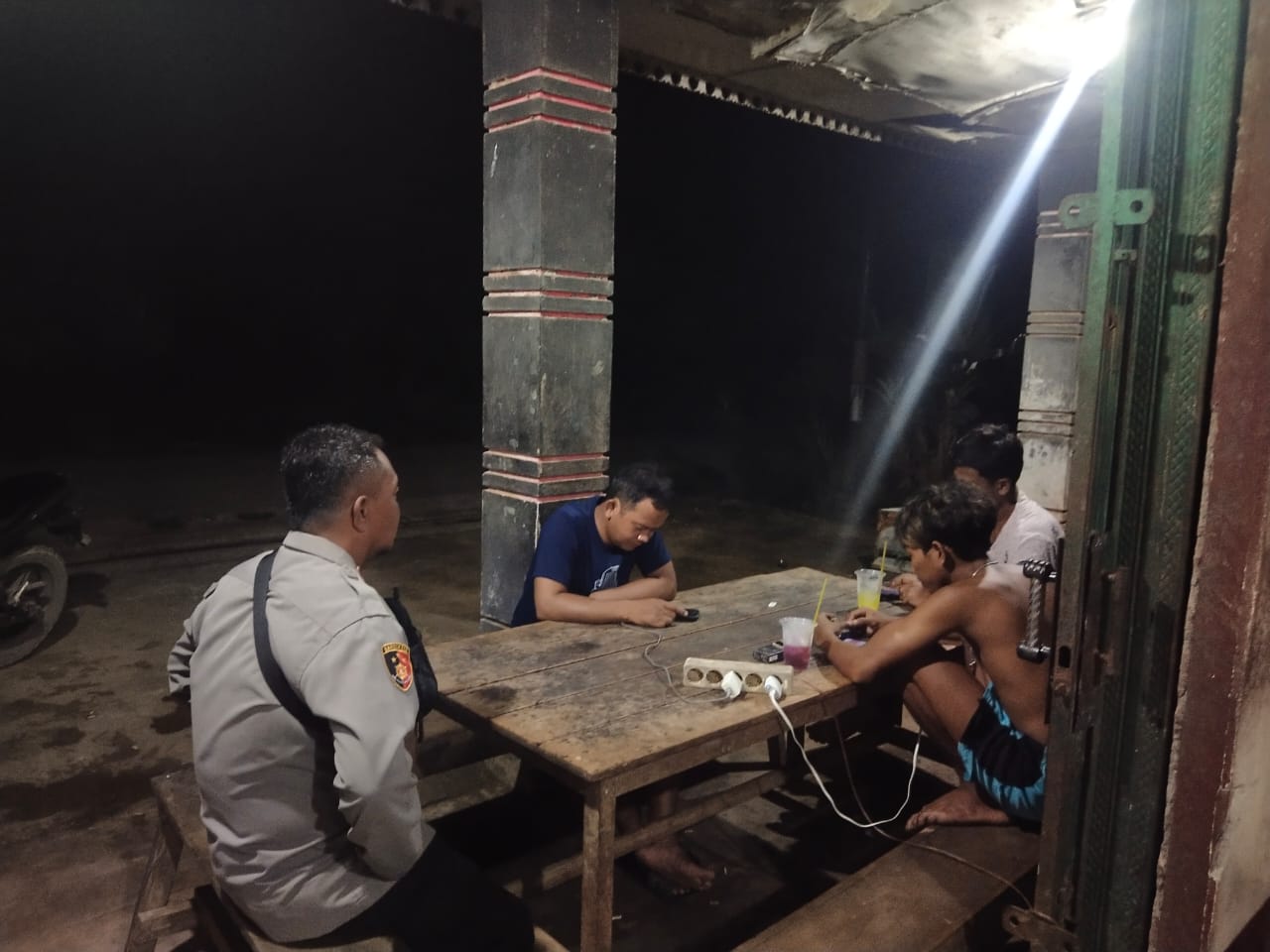 Untuk mencegah terjadinya gangguan Kamtibmas, personil Polsek Polsek Meranti Aipda Yordanus dan Briptu Eko Sanjaya melaksanakan patroli rutin malam hari di wilayah hukum Polsek Meranti, Rabu(27/08/2025).