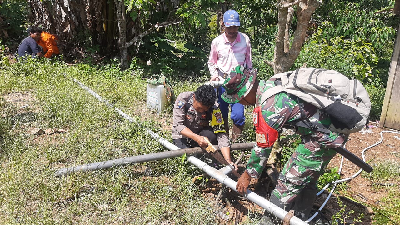 Bersama Bhabinsa dan warga setempat, Bripka Abdul Harik memimpin kerja gotong royong sederhana namun penuh makna — menyambungkan pipa air dari sumber mata air menuju permukiman warga Dusun Buloli. Meskipun bahan yang tersedia sangat terbatas, semangat kebersamaan mengalir lebih deras daripada air yang mereka perjuangkan.