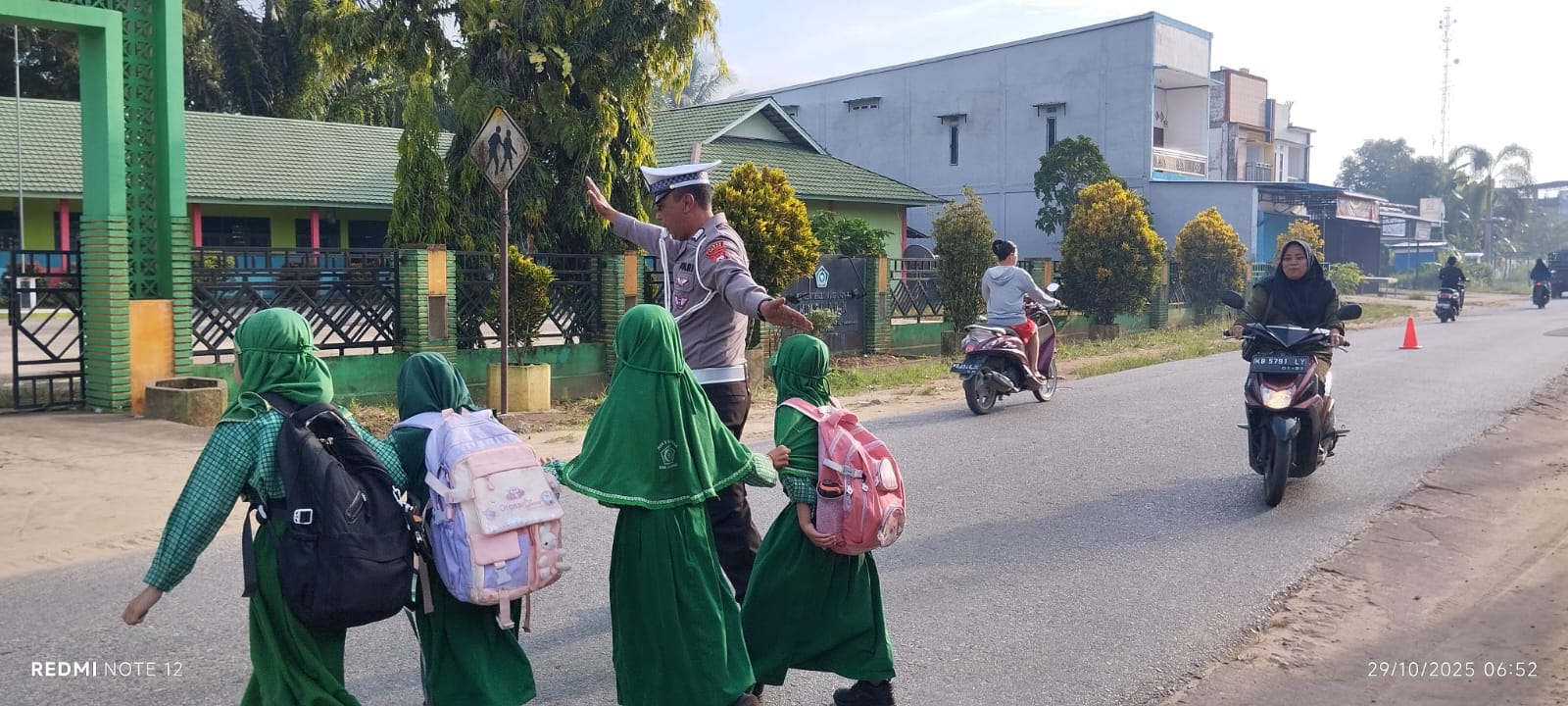 Polres Landak Polsek Mempawah Hulu Polda Kalbar melaksanakan kegiatan rutin pengaturan arus lalu lintas dilingkungan sekolah, rabu (29/10/25.)