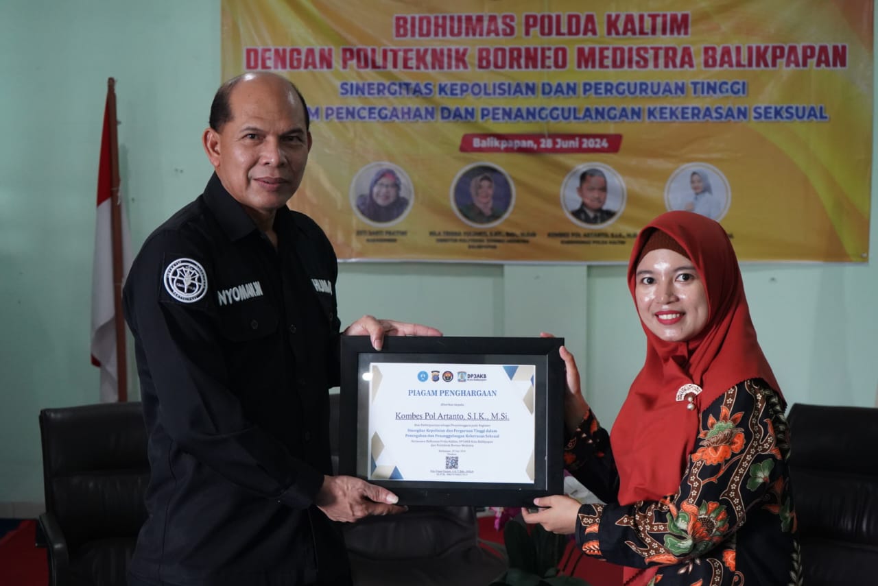 BALIKPAPAN — Bidhumas Polda Kaltim melaksanakan Sosialisasi tentang sinergitas Kepolisian dan Perguruan Tinggi dalam Pencegahan dan Penanggulangan Kekerasan Seksual di Aula Kampus Politeknik Borneo Medistra Balikpapan, Jumat (28/6/2024).