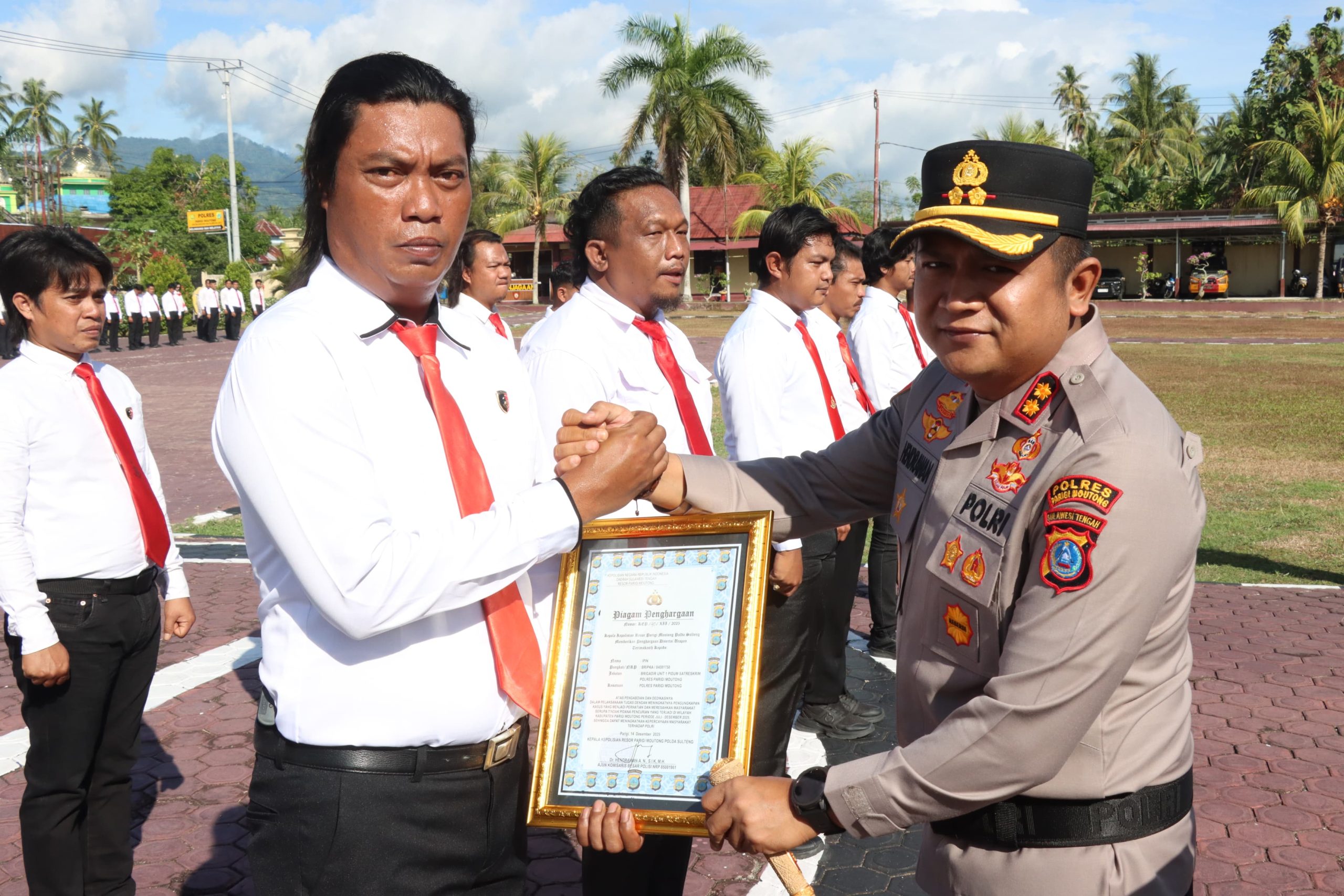 Dalam kesempatan tersebut, Kapolres Parigi Moutong secara langsung menyerahkan piagam penghargaan sebagai wujud pengakuan institusi atas keberhasilan Sat Reskrim dan Sat Resnarkoba dalam mengungkap kasus-kasus menonjol, sekaligus meningkatkan capaian kinerja satuan hingga meraih peringkat yang membanggakan di jajaran Polda Sulawesi Tengah.