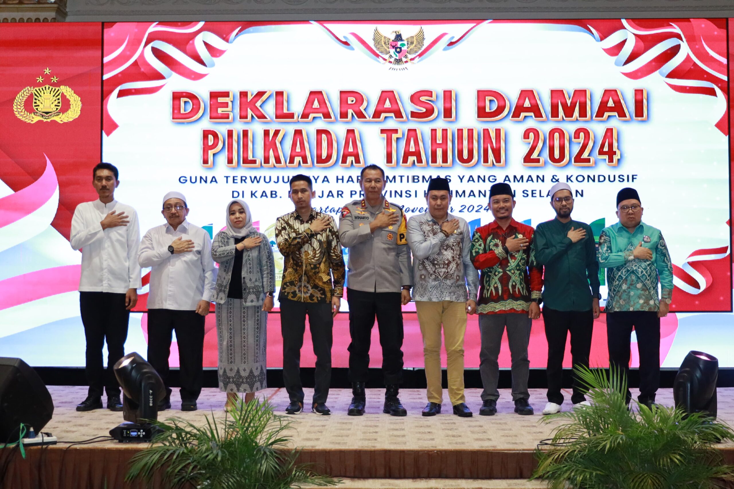 Kabid Humas Polda Kalsel Kombes Pol Adam Erwindi, S.I.K., M.H. mengatakan, dalam keterangannya Kapolda Kalsel Irjen Pol Winarto, S.H., M.H. menuturkan bahwa Deklarasi damai ini merupakan bentuk komitmen bersama agar kita saling menjaga, saling menghargai sehingga suasana Pilkada 2024 di Kabupaten Banjar bisa berjalan baik dan lancar tanpa mengganggu aktivitas masyarakat.