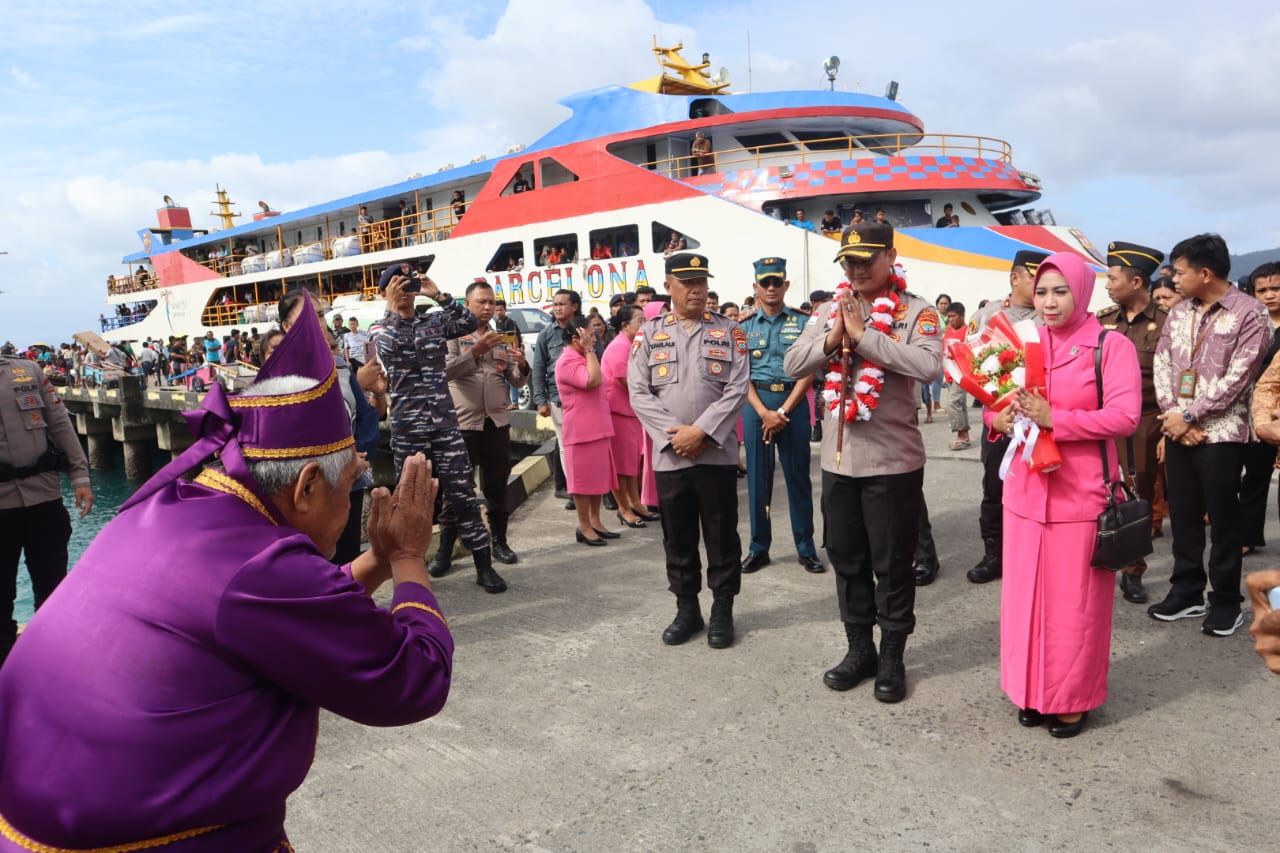 Manado ~ Ajun Komisaris Besar Polisi (AKBP) Arie Sulistyo Nugroho bersama Ketua Bhayangkari Cabang Talaud yang baru, Ny. Hikmah Arie Sulistyo tiba di Kabupaten Kepulauan Talaud, Kamis (18/7/2024).