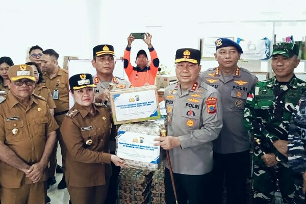 Kapolda Sulut juga secara simbolis menyerahkan bantuan kepada masyarakat yang terdampak bencana banjir bandang di Gedung Perpustakaan Kabupaten Kepulauan Sitaro.