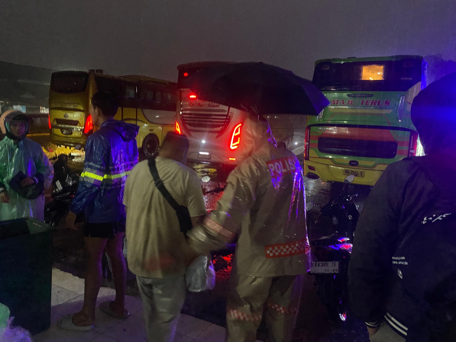 Dengan seragam dinas dibaluti jas hujan, Aipda Supar’am terlihat memayungi penumpang satu per satu, sekaligus membantu mengangkat dan membawakan barang bawaan mereka ke dalam bus. Tanpa ragu, ia memastikan para penumpang naik dengan aman dan nyaman, meski hujan terus mengguyur area terminal.