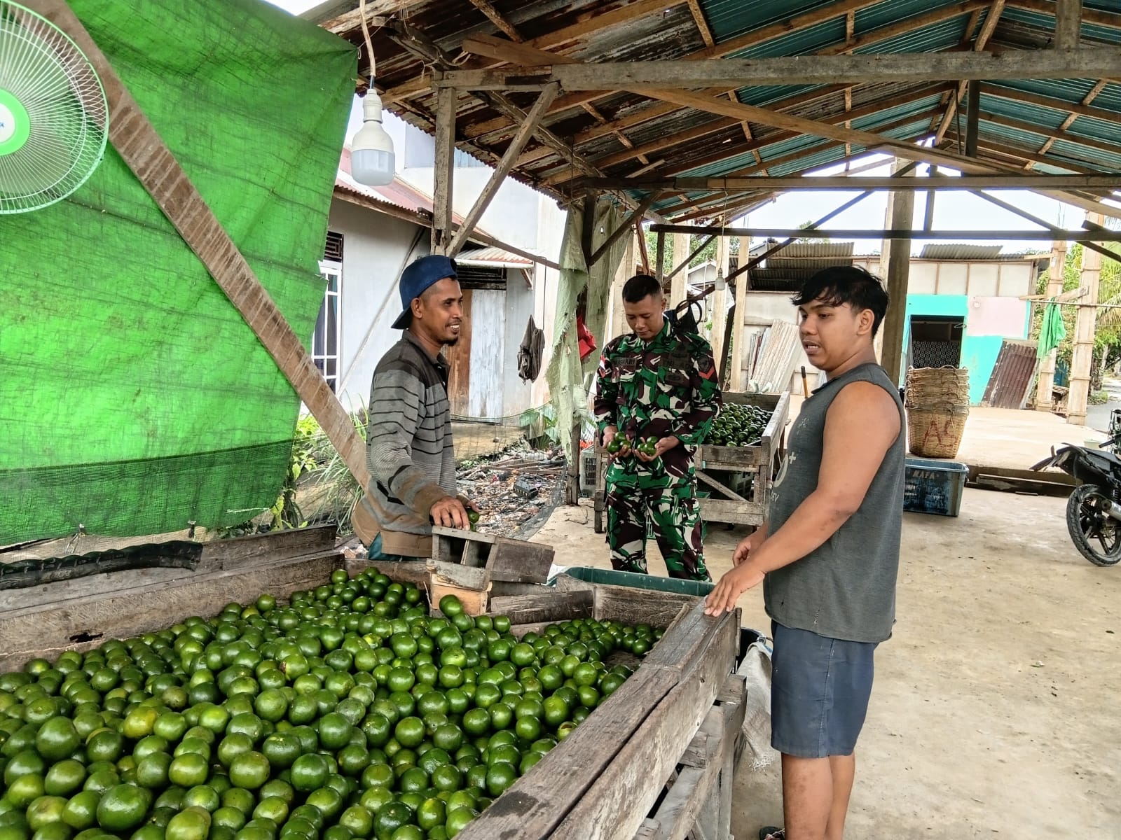 Kegiatan komsos tersebut dilaksanakan di tempat penampungan jeruk milik warga, di mana Babinsa berbaur langsung dengan para petani sembari berdialog santai membahas perkembangan tanaman, kendala yang dihadapi, serta upaya meningkatkan hasil panen.