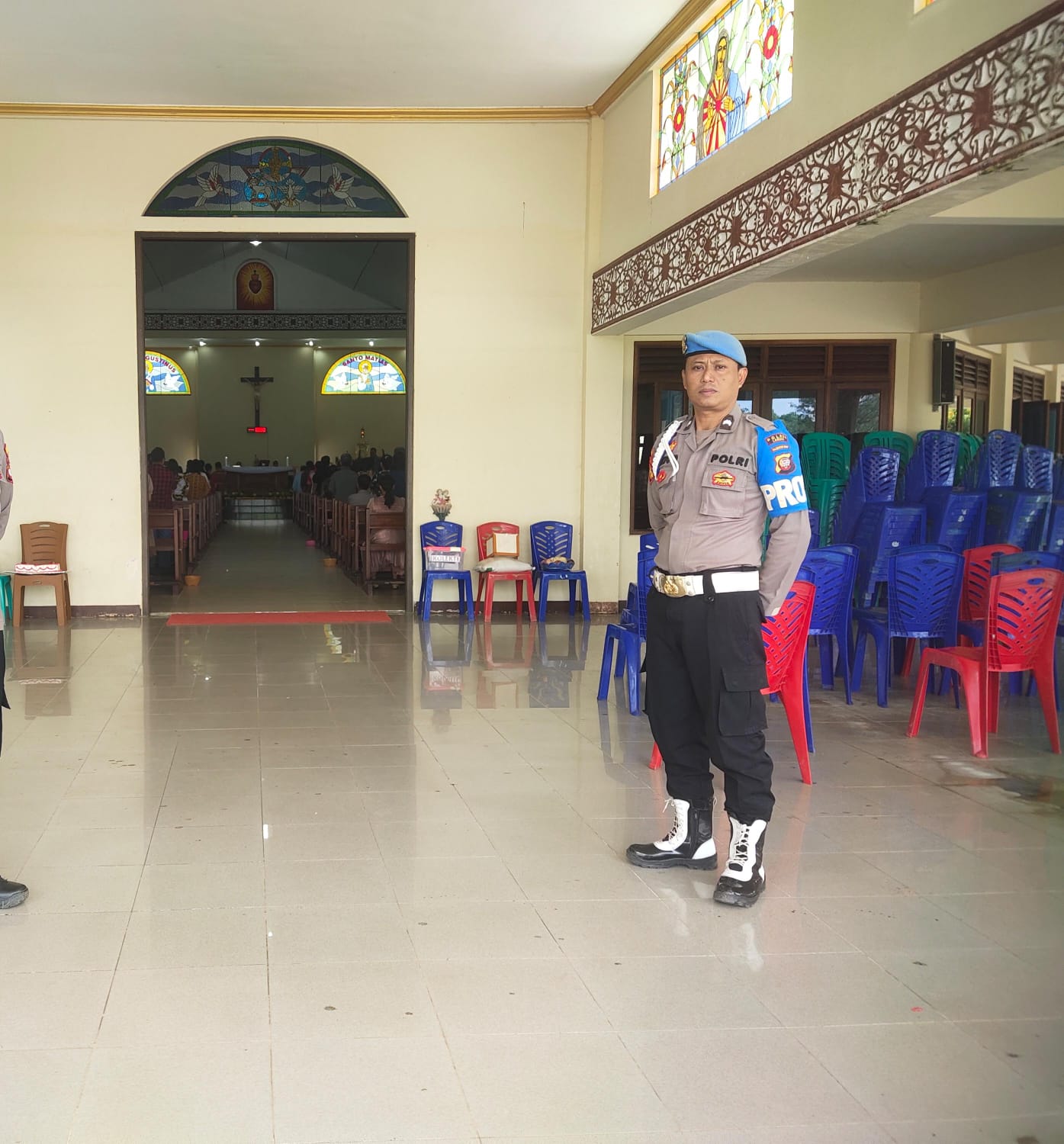Pengamanan ibadah misa tersebut seperti yang di lakukan oleh Aipda Mulyoto untuk memastikan pelaksanaan misa umat nasrani berjalan dengan aman tertib dan lancar.