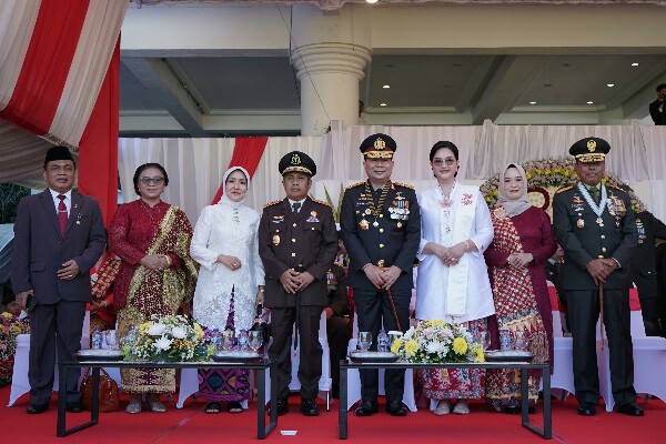 MANADO, Humas Polda Sulut – Kapolda Sulawesi Utara Irjen Roycke Harry Langie didampingi Ketua Bhayangkari Sulut Ny. Joan Roycke Langie menghadiri Upacara Peringatan HUT ke-80 RI, yang digelar Pemerintah Provinsi (Pemprov) Sulawesi Utara (Sulut), di Lapangan Kantor Gubernur Sulut, Minggu (17/8/2025).