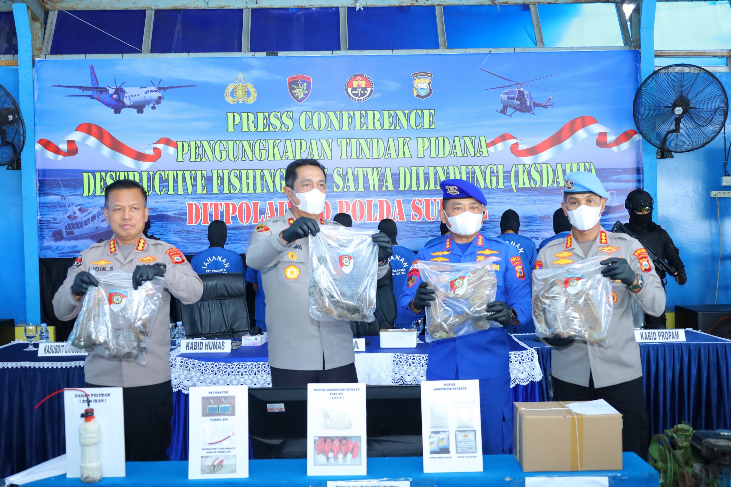 Ditpolair mengamankan ratusan barang bukti berupa material peledak dan perlengkapan untuk melakukan pengeboman ikan: 11 karung pupuk 25 kg, 89 jerigen bahan peledak, 64 botol bom rakitan siap ledak, 369 detonator, 74 potong sumbu berbagai ukuran, 2 kompresor, 2 gulung selang kompresor, 2 pasang kaki katak, 2 dakor, 18 bungkus bahan campuran peledak lainnya.