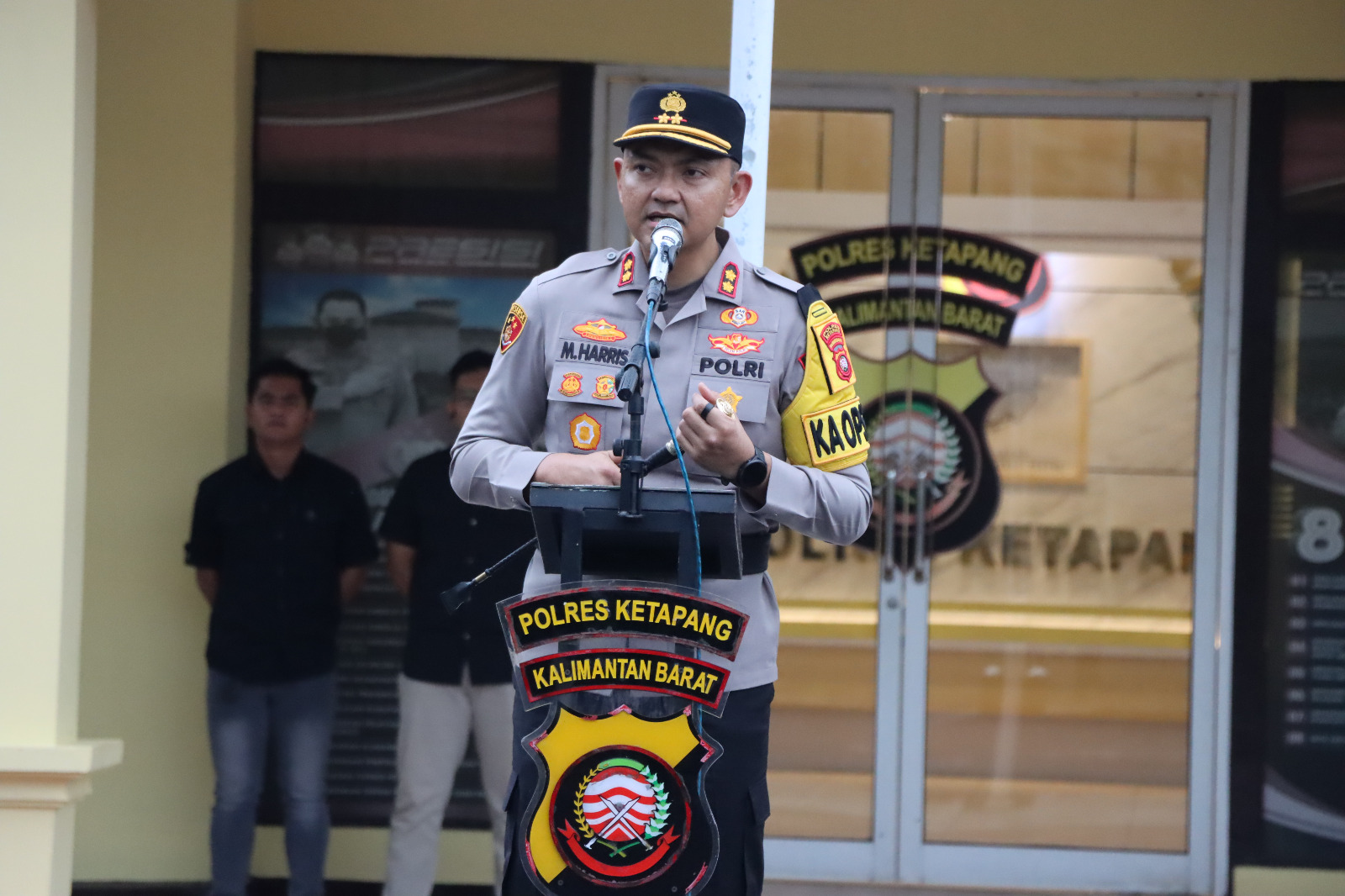 KETAPANG, Polda Kalbar – Kapolres Ketapang AKBP Muhammad Harris, S.H., S.I.K., M.I.K., CPHR memimpin langsung pelaksanaan Apel Pengamanan Malam Tahun Baru 2026 yang digelar di halaman Mapolres Ketapang, Jalan Brigjen Katamso No. 1, Kecamatan Delta Pawan, Kabupaten Ketapang, Rabu (31/12/2025).