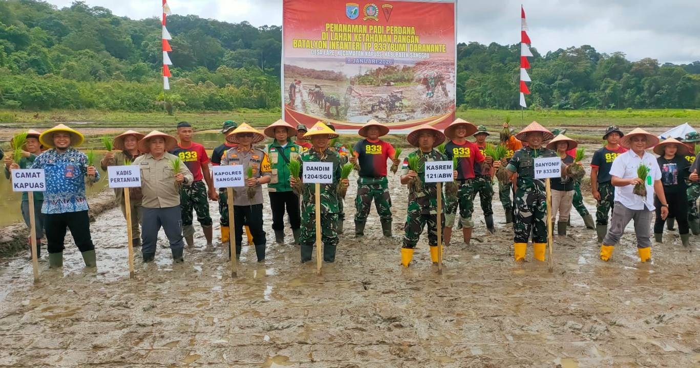 Sanggau, Polda Kalbar – Kegiatan penanaman padi perdana dalam rangka mendukung program swasembada pangan nasional digelar oleh Yon TP 833 Bumi Daranante di Desa Lape, Kecamatan Kapuas, Kabupaten Sanggau, Kamis (8/1/2026) pagi. Kegiatan yang dimulai sekitar pukul 09.00 WIB tersebut menjadi bagian nyata dukungan TNI bersama unsur terkait terhadap agenda strategis ketahanan pangan Presiden Republik Indonesia.