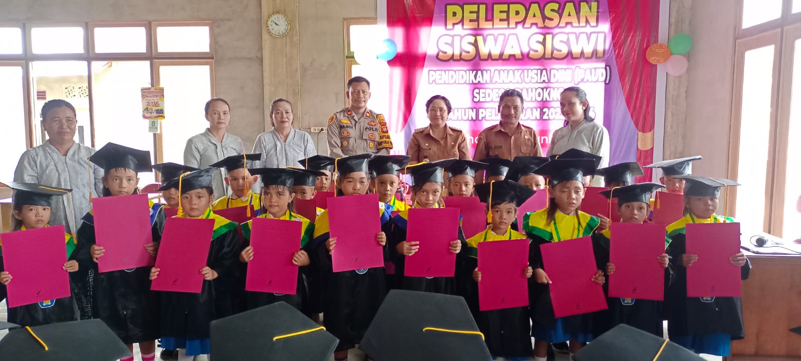 selamat kepada anak-anakku yang telah lulus PAUD dan akan melanjutkan pendidikannya di bangku sekolah dasar untuk menjadi pelajar yang unggul serta menjadi kebanggaan bagi kita semua,” ucapnya.