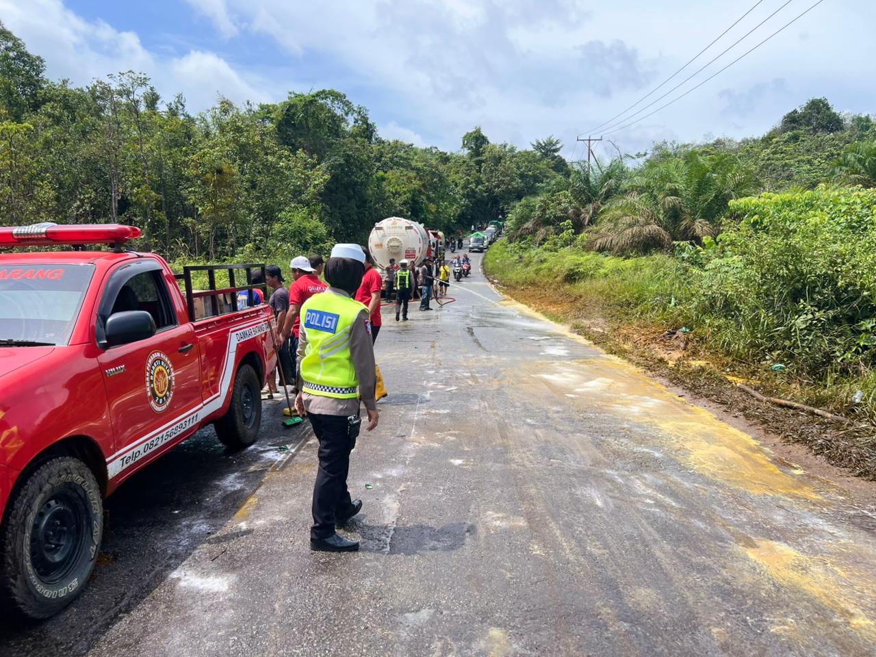 Petugas pemadam kebakaran dikerahkan untuk membersihkan tumpahan CPO, sementara hingga laporan ini disusun, personel kepolisian masih berada di lokasi untuk memastikan kondisi jalan kembali aman serta melakukan penyelidikan lebih lanjut terkait penyebab kecelakaan. (Dny Ard / Humas Res Sgu)