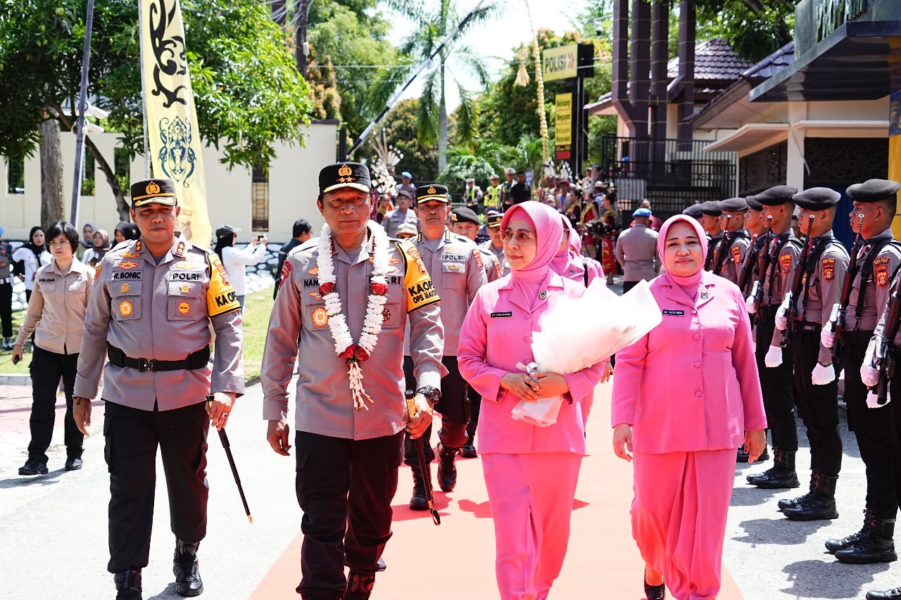 Kedatangan Kapolda Kaltim bersama Ketua Bhayangkari Daerah Kaltim disambut dengan tradisi tepung tawar oleh tokoh adat Kutim dan pengalungan bunga serta jajar kehormatan oleh personil Polres Kutim.