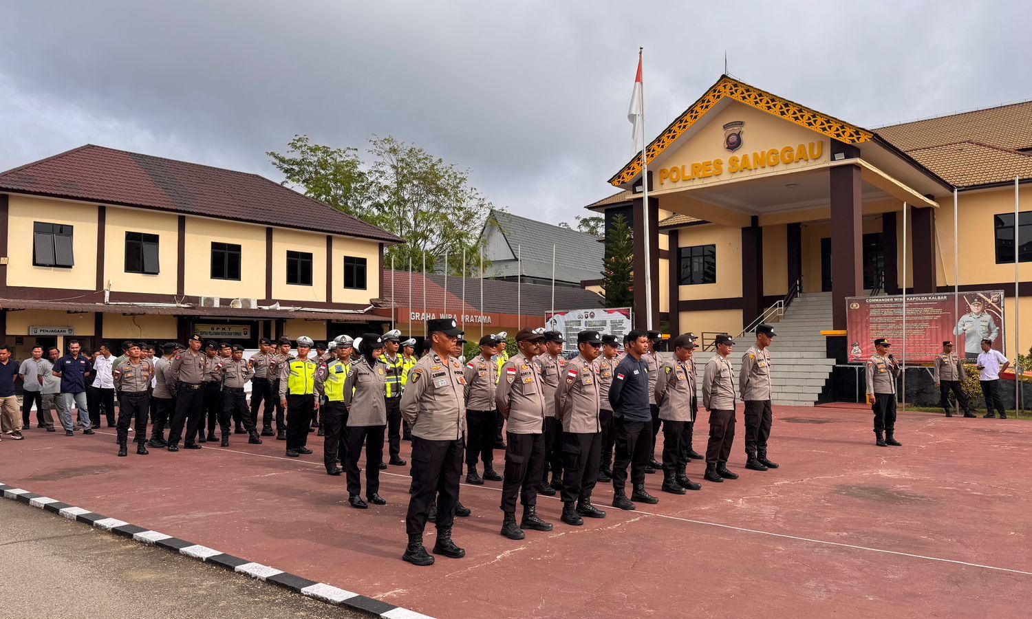 Menariknya, latihan ini tidak hanya diikuti oleh personel berseragam dinas, tetapi juga melibatkan personel berpakaian sipil dari fungsi Reserse dan Intelijen, serta aparatur sipil negara (ASN) Polres Sanggau yang turut bergabung dalam barisan.