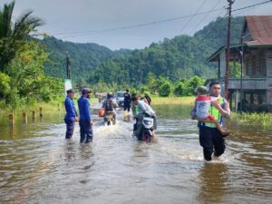 Jalan Trans Sulawesi tergenang banjir. Satlantas Polres Morowali Utara bantu warga melintasi banjir