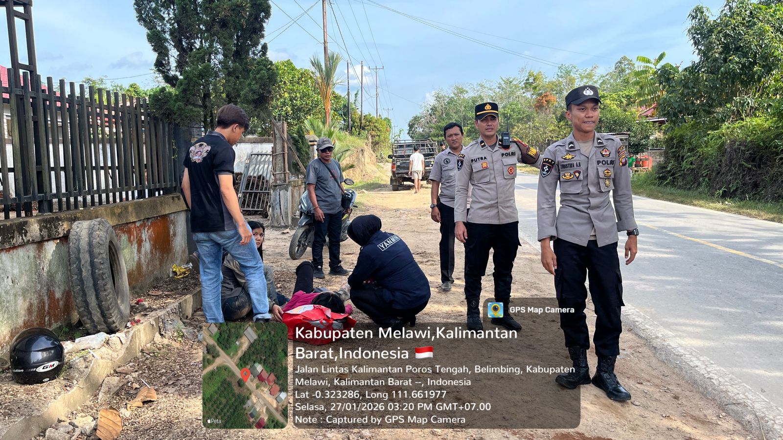Polres Melawi Polda Kalbar – Pamapta II Polres Melawi Ipda Rahmad Syahputra Hutagalung, S.H., Bersama personal bergerak cepat mendatangi Tempat Kejadian Perkara (TKP) kecelakaan lalu lintas di Desa Labang, Selasa (27/1/2026).