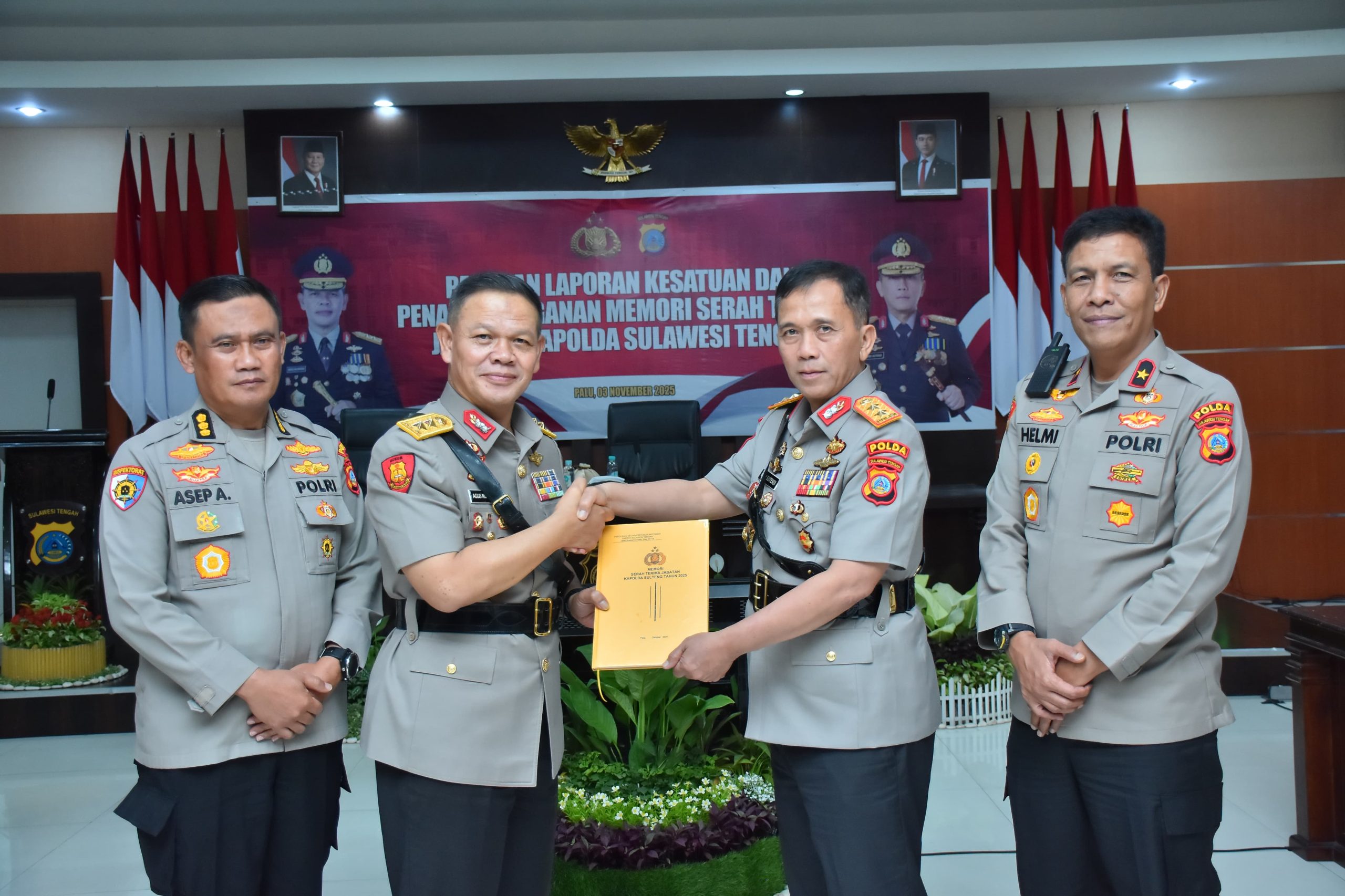 Palu – Kepolisian Daerah (Polda) Sulawesi Tengah menggelar kegiatan paparan laporan kesatuan dan penandatanganan memori serah terima jabatan Kapolda Sulawesi Tengah, bertempat di Aula Rupatama Polda Sulteng, Senin (3/11/2025). Kegiatan tersebut menjadi bagian penting dalam rangkaian pergantian kepemimpinan di tubuh Polda Sulteng.