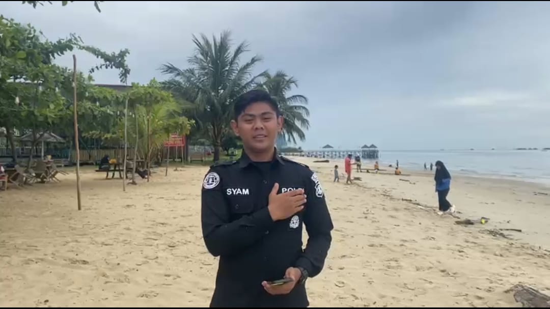 Personel Satgas Humas Ops Lilin Mahakam 2025 Lakukan Live Report Pengamanan di Pantai Kilang Balikpapan