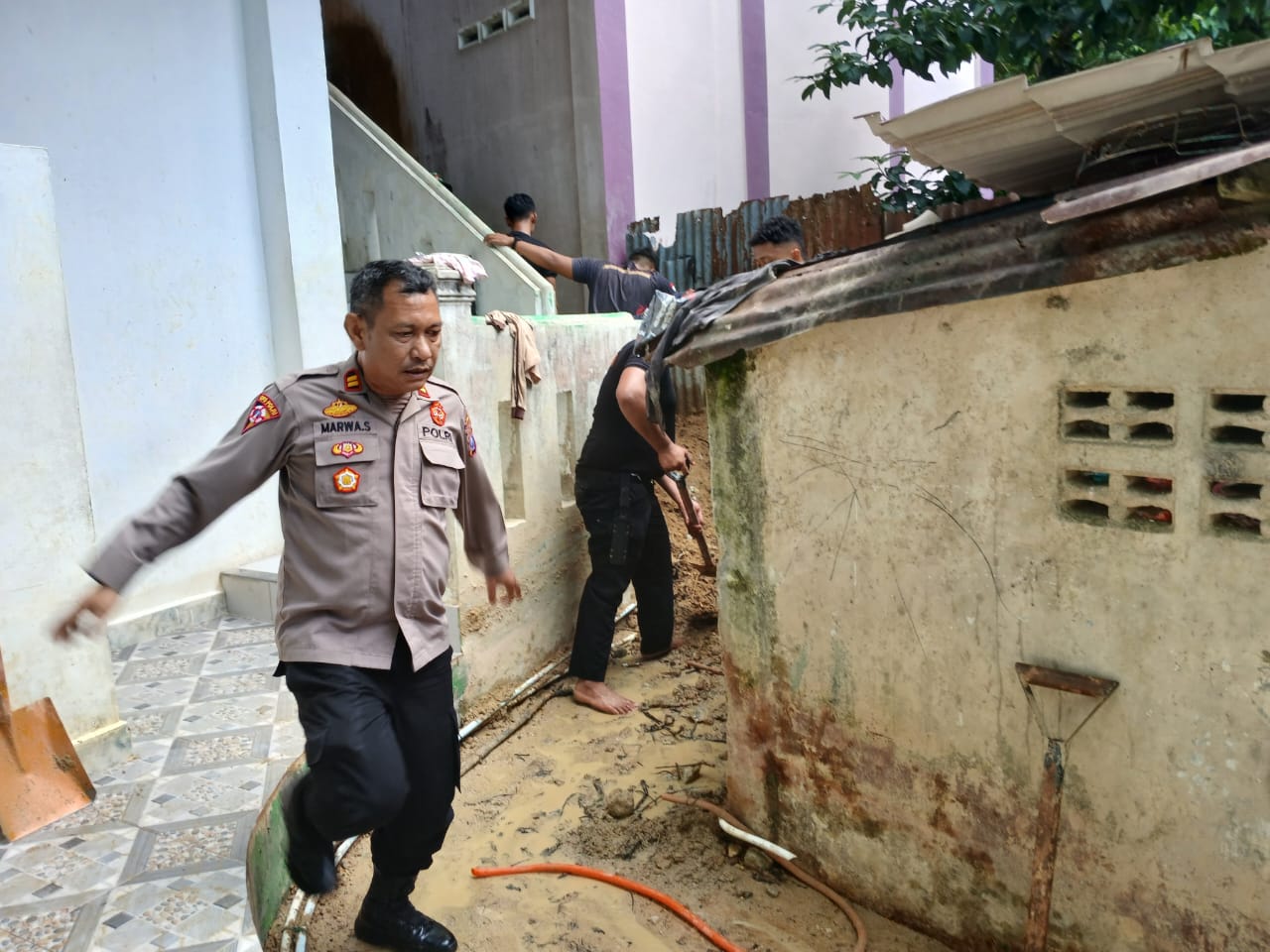 Kapolsek Sibolga Sambas, IPTU Marwa, turun langsung memimpin kegiatan tersebut bersama personel Polres Sibolga dan personel BKO Brimob. Dengan menggunakan peralatan seadanya, personel gabungan bahu-membahu membersihkan material longsor demi membuka kembali akses jalan agar dapat dilalui oleh warga.