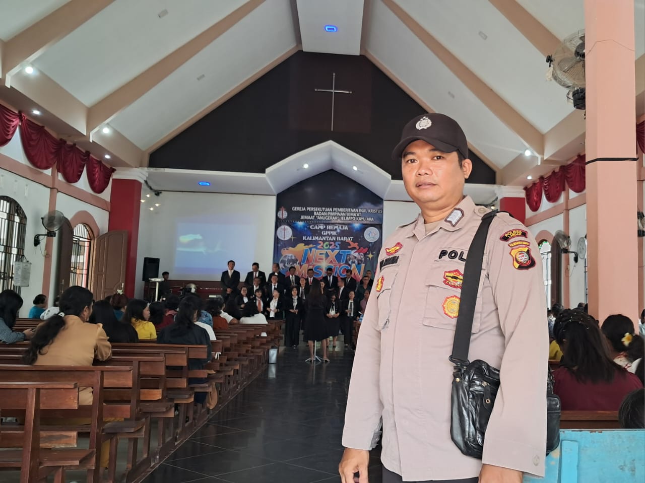 Polsek Ngabang – Polres Landak – Polda Kalbar, Dalam rangka memberikan rasa aman kepada masyarakat yang melaksanakan ibadah Minggu bagi umat kristiani, Anggota Polsek Ngabang melaksanakan Pengamanan di beberapa gereja di setiap minggunya, salah satunya adalah di GPPIK Jemaat Anugerah Kecamatan Jelimpo Kabupaten Landak. Minggu (31/08/2025)