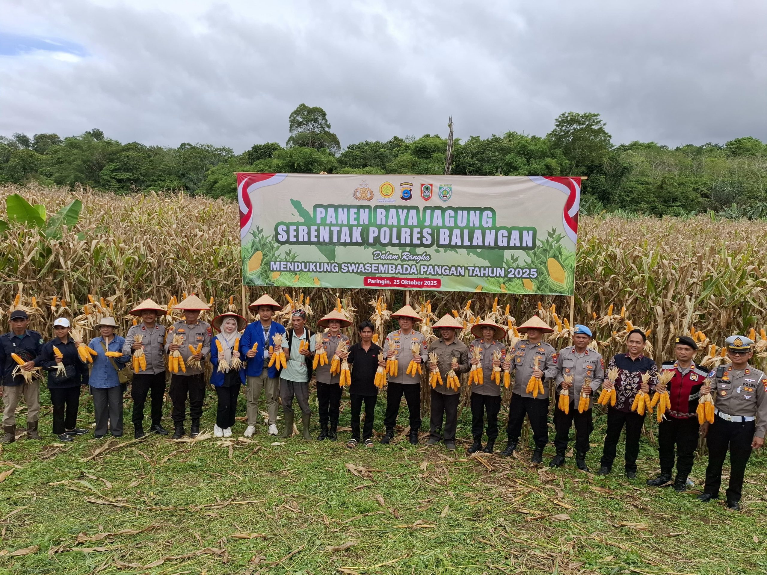 Polres Balangan, Polda Kalsel – Mendukung program pemerintah di bidang ketahanan pangan, Polres Balangan melaksanakan kegiatan Panen Raya Jagung Serentak Polda Kalimantan Selatan Tahun 2025, yang berlangsung di Desa Mauya Kecamatan Halong, Kabupaten Balangan, Sabtu (25/10/25) siang.