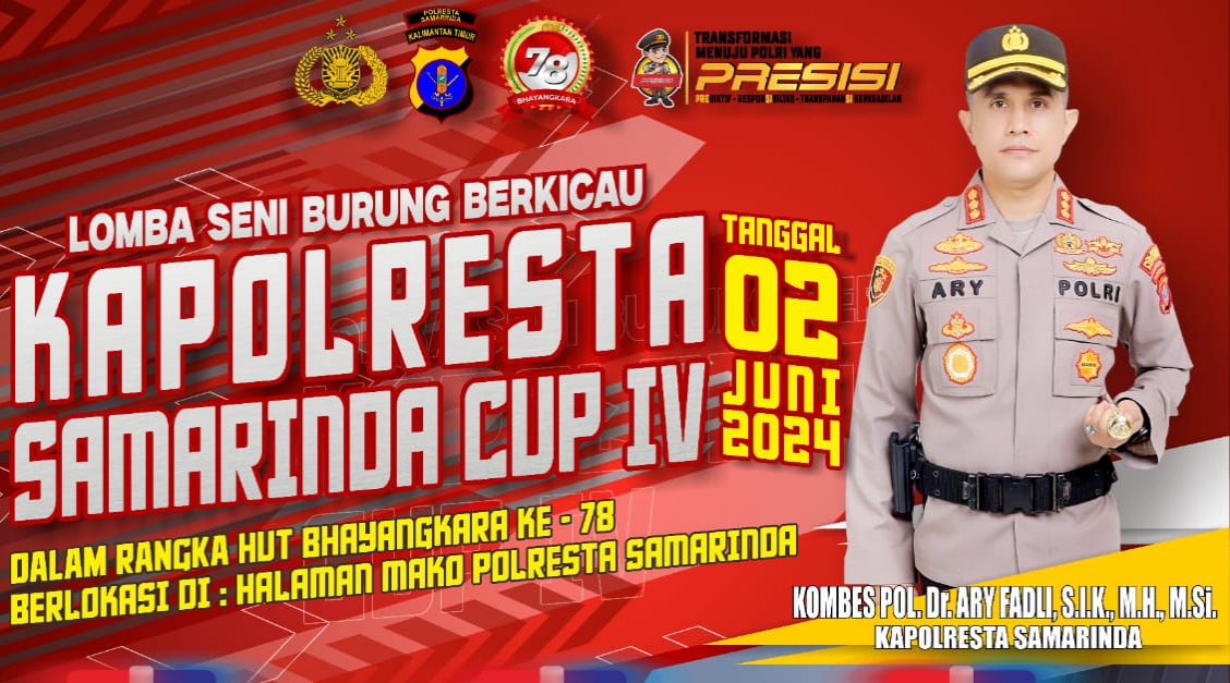 KOTA SAMARINDA – Dalam rangka memperingati HUT Bhayangkara ke-78, Polresta Samarinda mengundang seluruh pecinta burung berkicau dari Kalimantan Timur dan sekitarnya untuk berpartisipasi dalam perlombaan Lomba Seni Burung Berkicau KAPOLRESTA SAMARINDA CUP IV. Acara ini akan diselenggarakan di Mako Polresta Samarinda pada tanggal 2 Juni 2024.