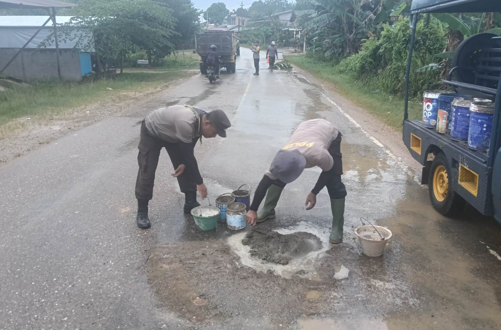 Polsek Kembayan Kembali Tambal Jalan Rusak di Tiga Titik Strategis Demi Keselamatan Warga