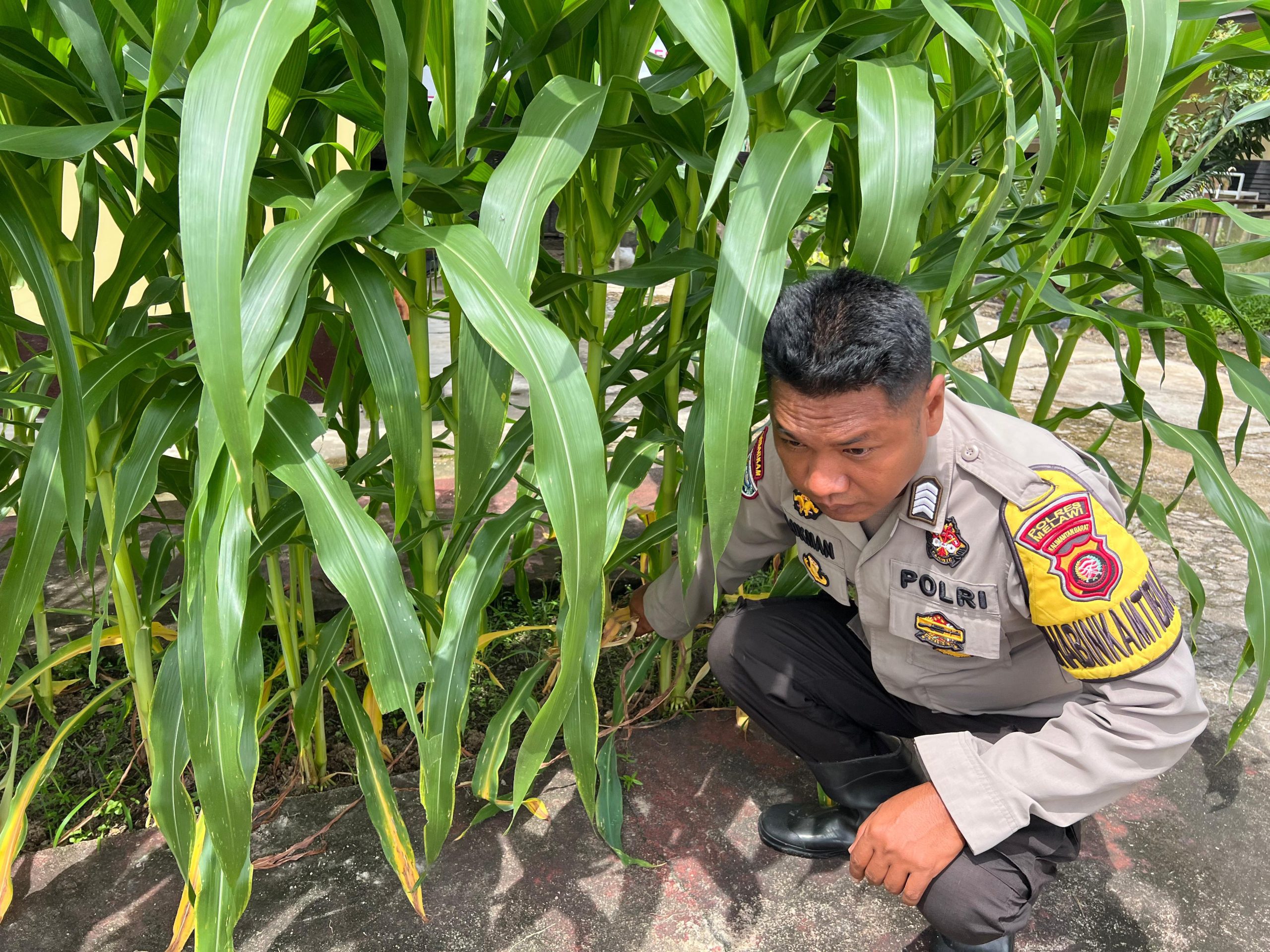 Polisi penggerak Bripka Lukman Tirtono melakukan perawatan terhadap tanaman Jagung di sela sela kesibukan jam dinas untuk hasil yang maksimal.