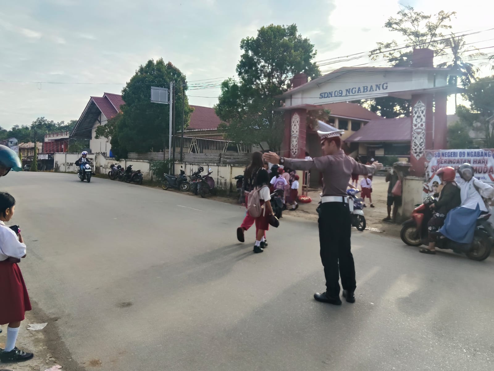 Polsek Ngabang Terus Tingkatkan Keamanan Para Pelajar Saat Masuk Sekolah Khususnya Dipersimpangan Dengan Mengatur Arus Lalulintas
