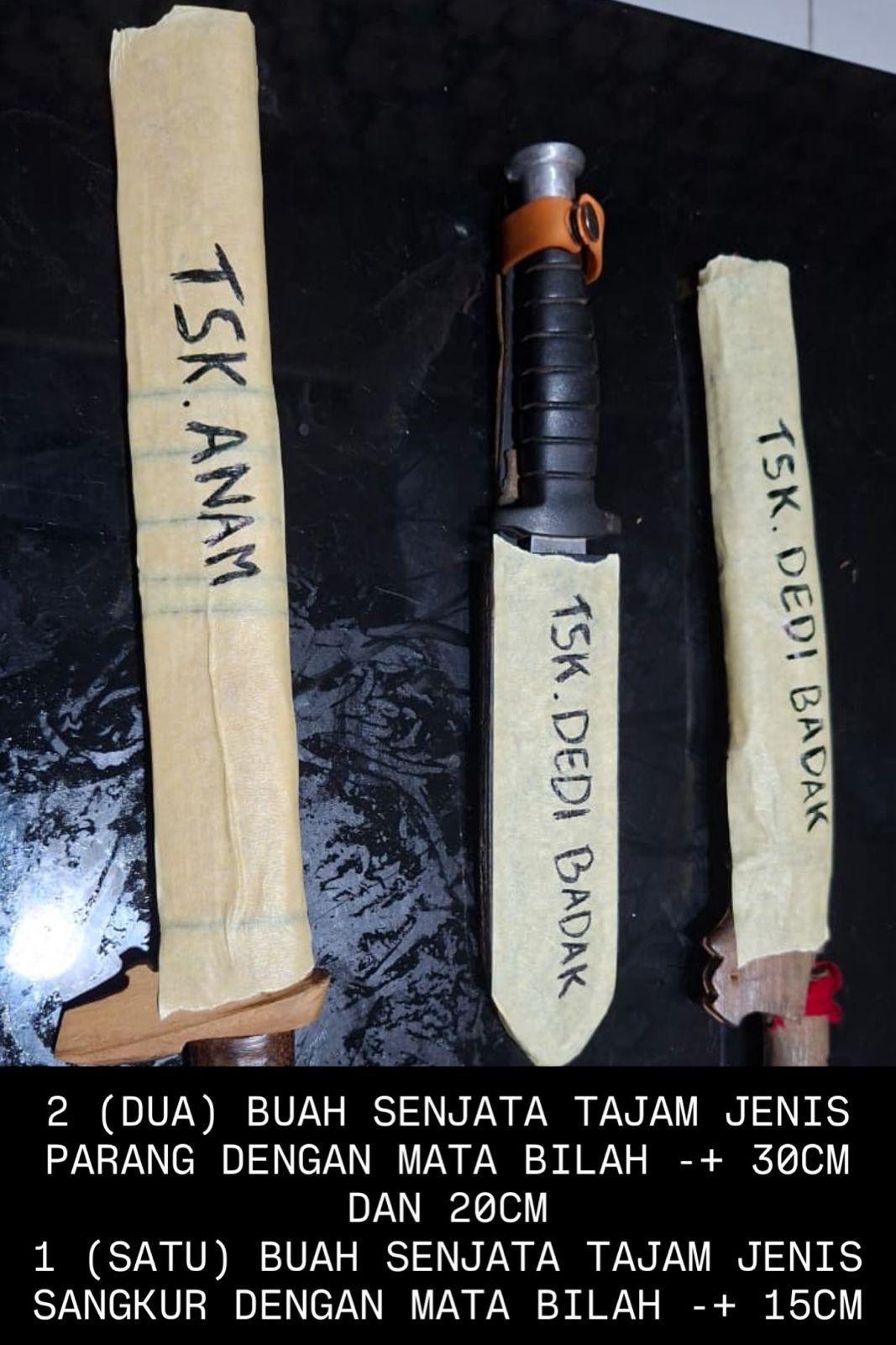 Dari tangan pelaku, polisi mengamankan sejumlah barang bukti berupa dua bilah parang dengan panjang sekitar 30 cm dan 20 cm, serta satu bilah sangkur dengan panjang sekitar 15 cm. Selain itu, hasil visum korban turut dijadikan barang bukti dalam proses penyidikan.