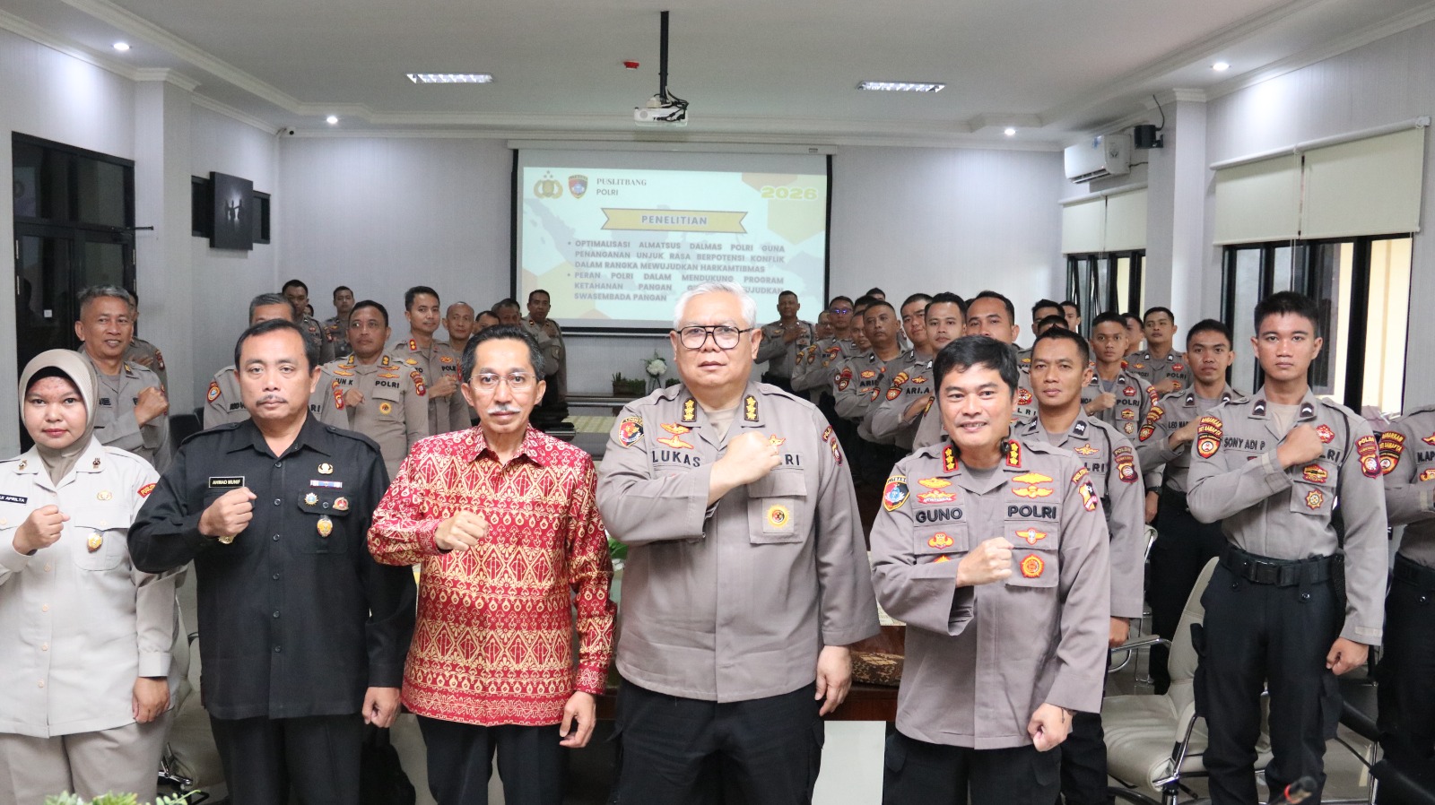 Ketua Tim Peneliti, Kombes Pol. Guno Pitoyo, S.I.K., M.H., menyampaikan bahwa penelitian ini penting untuk menjawab tantangan dinamika aksi massa modern.