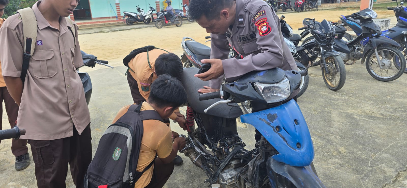 Kehadiran petugas kepolisian dengan seragam dinas lengkap sontak menarik perhatian para pelajar. Satu per satu kendaraan roda dua yang terparkir diperiksa. Hasilnya, sebanyak 14 (empat belas) sepeda motor kedapatan menggunakan knalpot brong yang tidak sesuai standar.