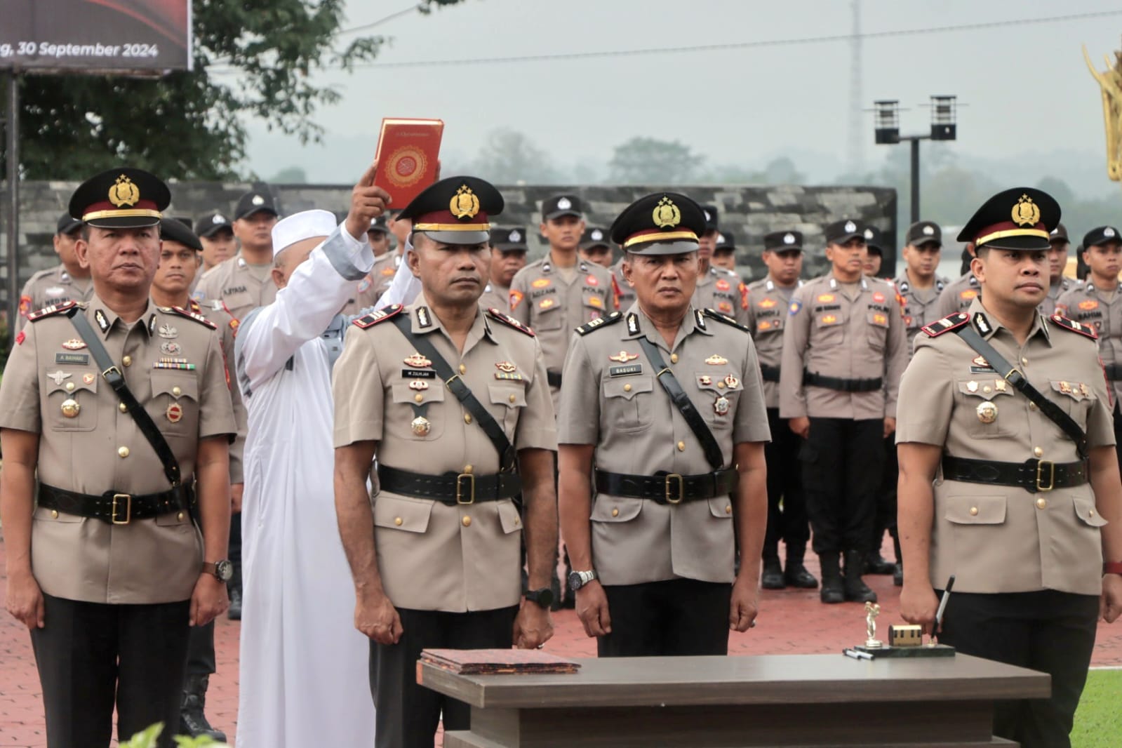 Prosesi pengambilan sumpah berlangsung khidmat, disaksikan oleh rohaniawan. Selanjutnya, pejabat baru dan lama menandatangani berita acara serah terima jabatan, berita acara penyumpahan, dan fakta integritas, yang kemudian disahkan oleh Kapolres sebagai inspektur upacara.