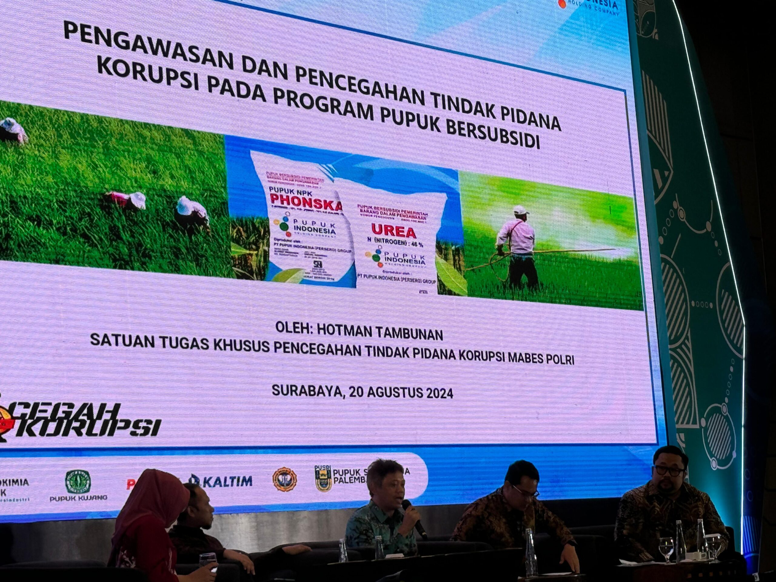 Jakarta ~ Hotman Tambunan dan Yudi Purnomo Harahap Satgas Pencegahan Korupsi Polri melakukan kegiatan pembinaan kepada Distributor Pupuk Subsidi Se-Indonesia di Surabaya bersama dengan Kementerian Perdagangan RI. Adapun kegiatan tersebut merupakan undangan dari PT Pupuk Indonesia Holding Company selalu pelaksana program pupuk bersubsidi yg ditunjuk oleh Kementerian BUMN dan Kementerian Perdagangan.