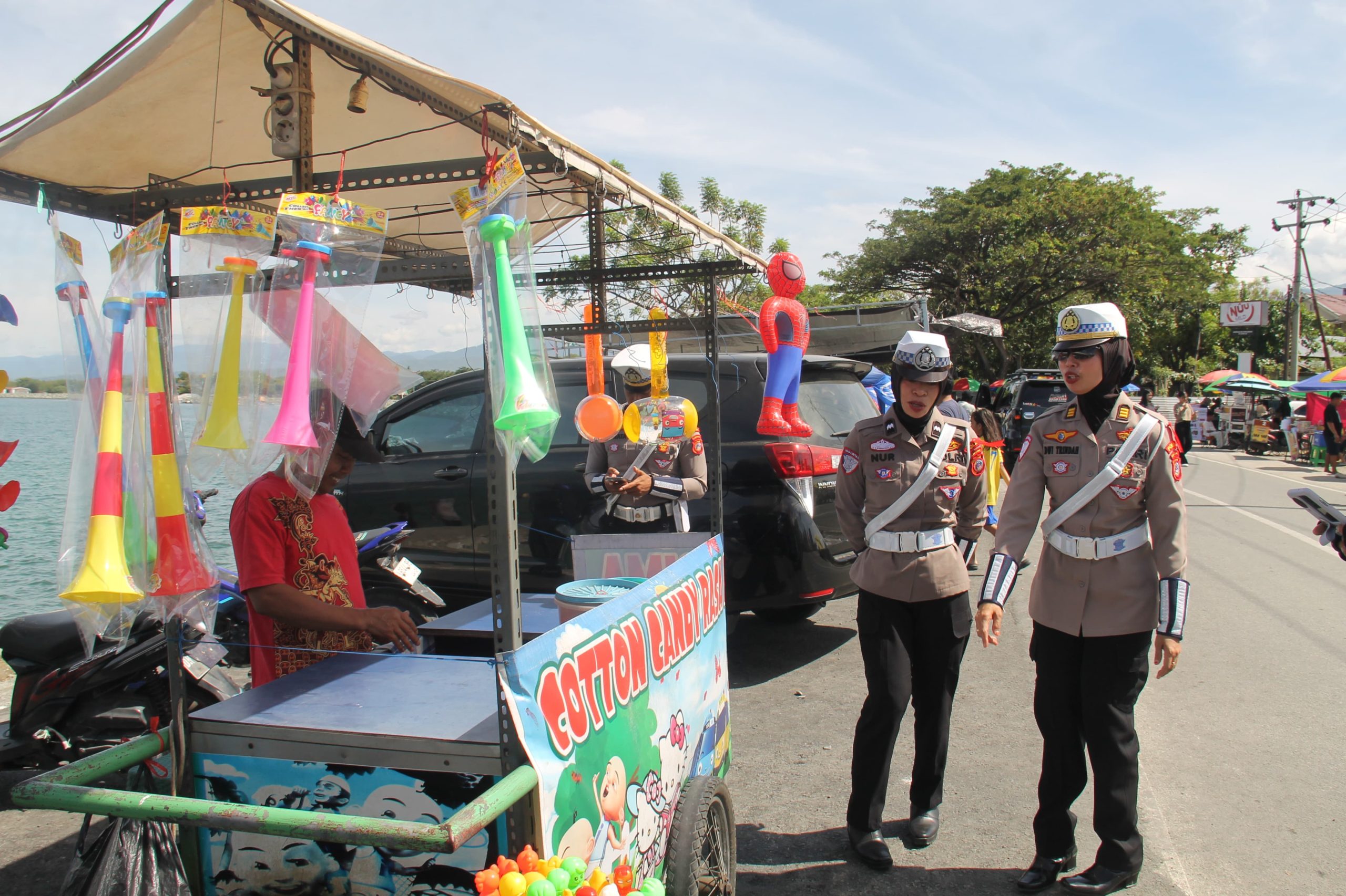 Palu, Satuan Tugas (Satgas) III Kamseltibcarlantas (Keamanan, Keselamatan, Ketertiban, dan Kelancaran Lalu Lintas) Polda Sulawesi Tengah menyasar tempat wisata di Kampung Nelayan, Kota Palu, Sulawesi Tengah. Minggu 28/12/2025
