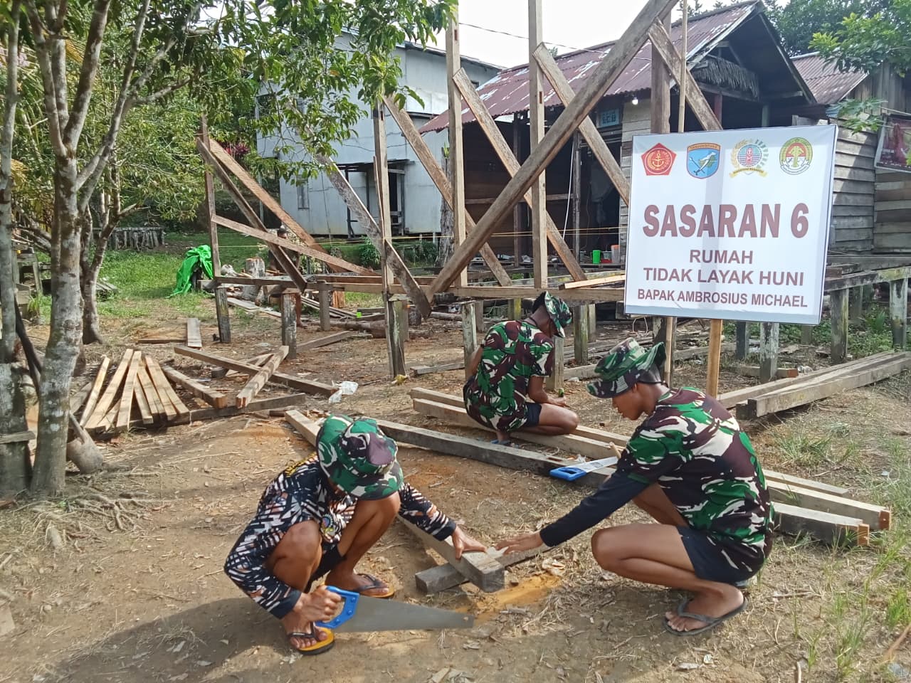 Sejak fajar menyingsing, sinergi antara prajurit TNI dan warga setempat tampak nyata. Di bawah cuaca yang cukup menyengat, mereka bahu-membahu menyusun material bangunan demi mewujudkan hunian yang lebih layak bagi masyarakat penerima manfaat.