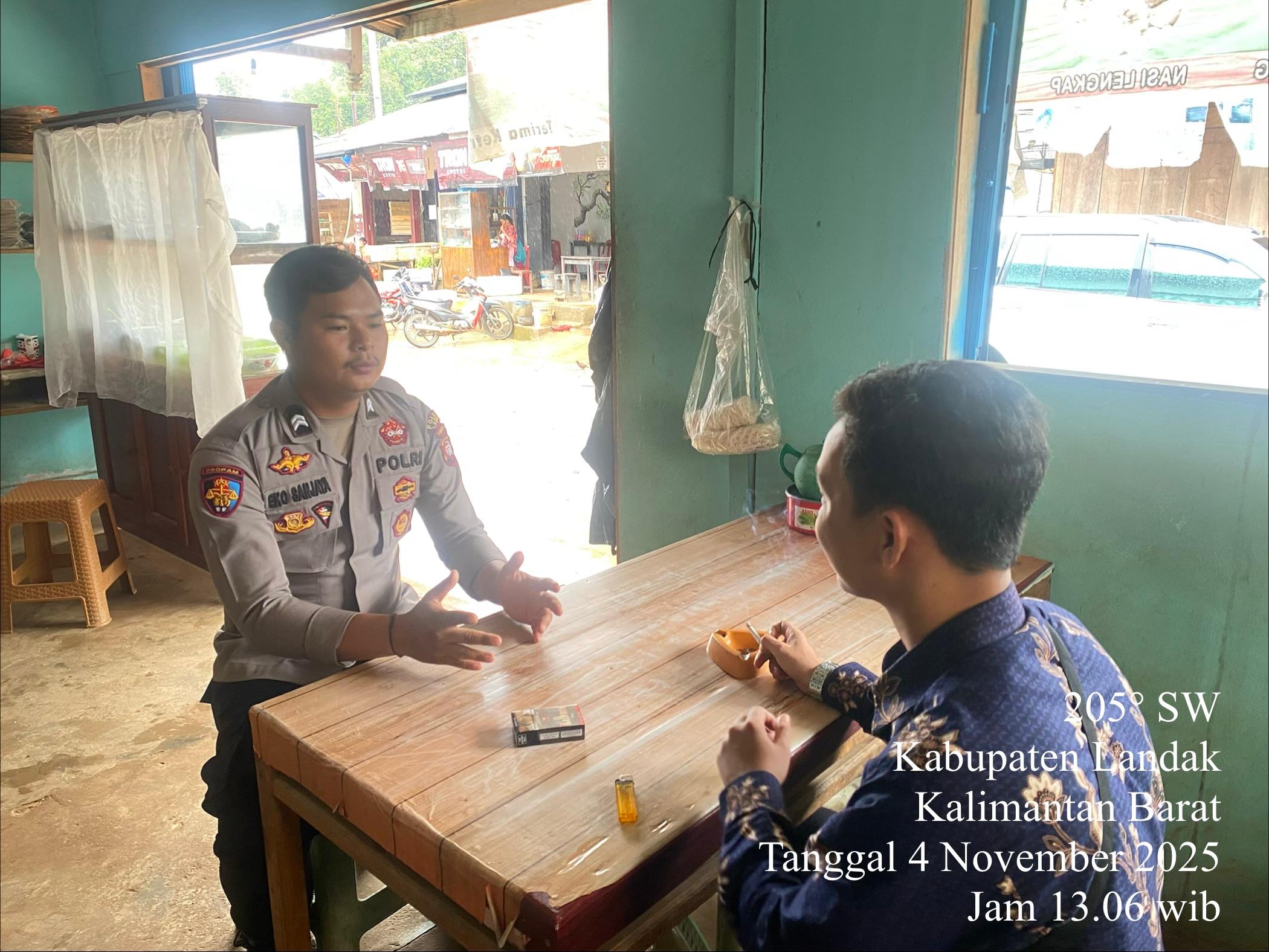 Tampak seorang anggota Polsek Meranti duduk santai di sebuah warung sederhana di wilayah Kabupaten Landak, berbincang dengan warga sambil menikmati suasana siang hari. Melalui pertemuan informal seperti ini, polisi dapat mendengarkan langsung aspirasi dan keluhan masyarakat terkait keamanan lingkungan sekitar.