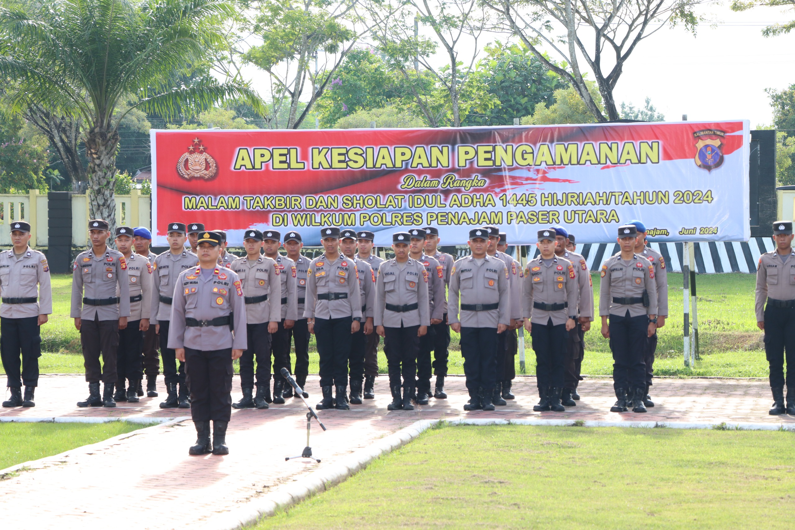 PENAJAM – Dalam rangka mempersiapkan pengamanan menyambut perayaan Idul Adha 1445 H, TNI-Polri beserta stakeholder terkait menggelar apel pasukan di Markas Komando Polres Penajam Paser Utara (PPU). Apel ini turut dihadiri oleh Waka Polres PPU, Kompol Bambang Hardiyanto, SH, yang mewakili Kapolres PPU, AKBP Supriyanto, SIK, M.Si. Minggu (16/06/24).