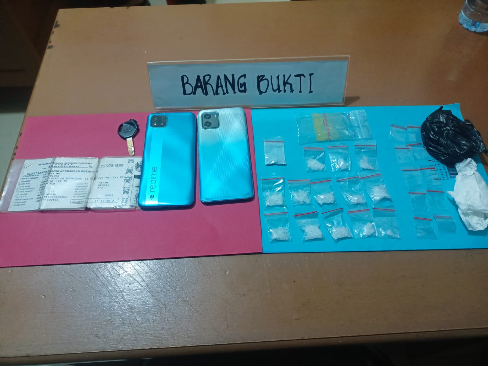 Selain itu, polisi juga menemukan dua unit handphone di tubuh tersangka, yakni handphone merk Realme berwarna biru yang ditemukan di tangan kanannya dan handphone merk VIVO berwarna biru di saku celana depan kanan. Di saku celana belakang ditemukan satu lembar fotokopi STNK bernomor 8175609/KB/2008. Saat dilakukan penggeledahan sepeda motor, polisi tidak menemukan barang bukti lainnya. Tersangka DY beserta barang bukti kemudian diamankan di Polres Landak.