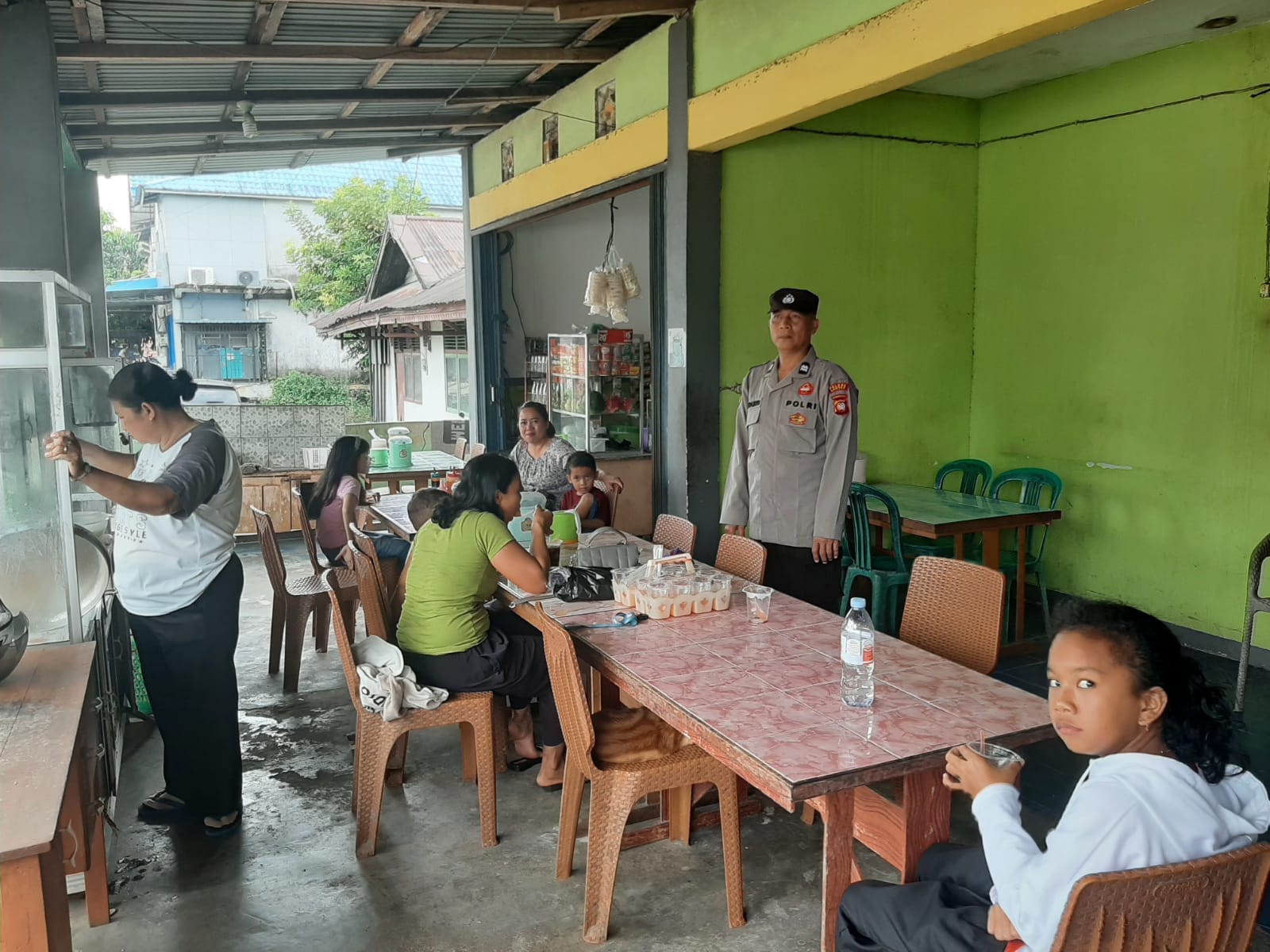Kehadiran polisi di tengah-tengah aktivitas masyarakat ini menjadi bukti nyata bahwa tugas menjaga situasi kamtibmas (keamanan dan ketertiban masyarakat) tidak mengenal hari libur. Dengan penuh ramah, petugas menyapa warga yang sedang bersantap siang, sekaligus memberikan rasa aman dan kedekatan antara polisi dan masyarakat.