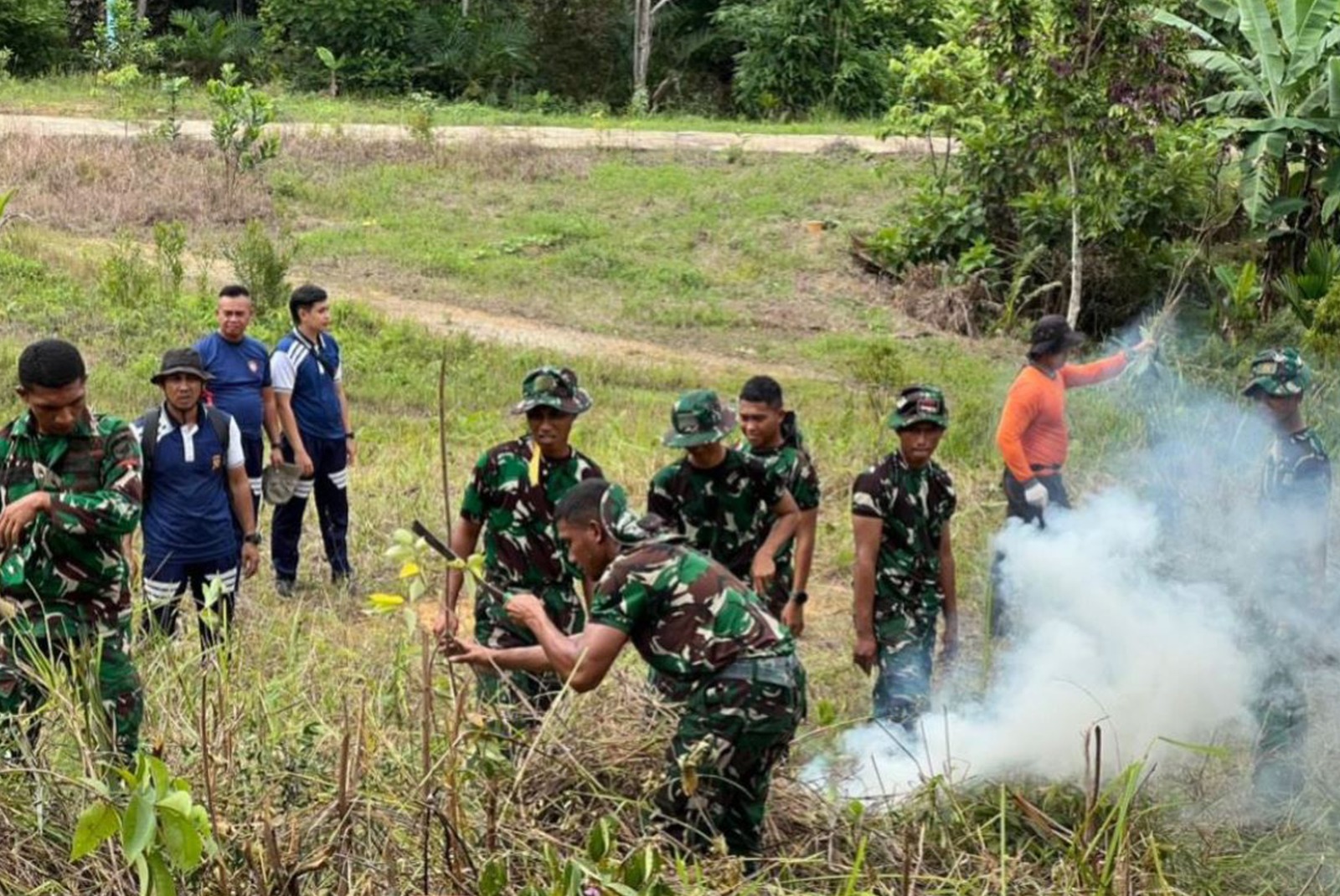 Kegiatan berjalan lancar dengan semangat kebersamaan antara personel Polres Sanggau dan prajurit Yonif TP 833/BD. Seluruh peserta bekerja sama membersihkan area lapangan menggunakan peralatan manual seperti cangkul, sabit, dan alat pemotong rumput.