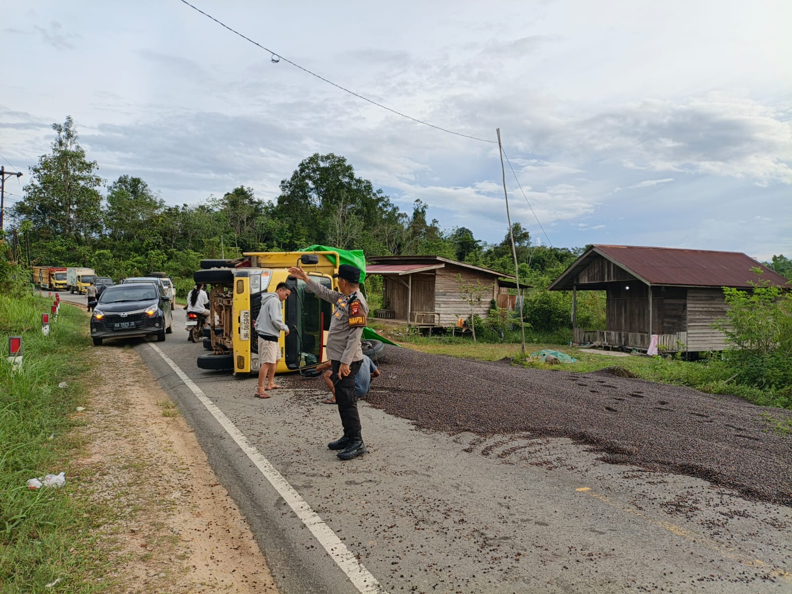 Akibat insiden itu, muatan kernel yang diangkut truk berserakan hampir di sepanjang badan jalan. Tumpahan biji kelapa sawit tersebut menghambat arus lalu lintas dari kedua arah dan menyebabkan antrean kendaraan.